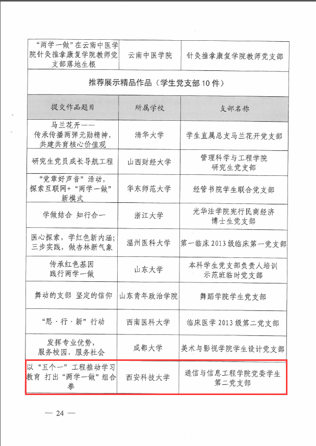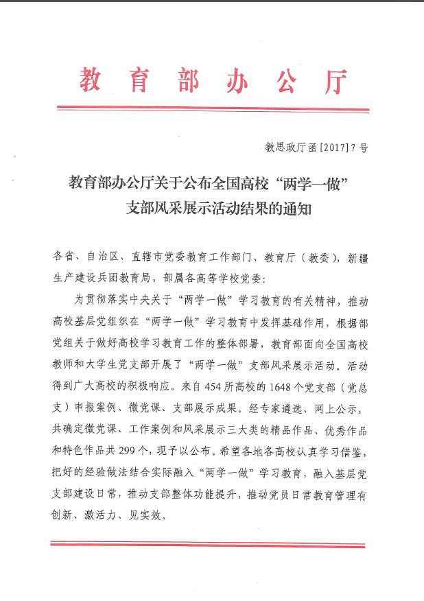据悉,全国高校“两学一做”支部风采展示活动由教育部主办,旨在贯彻落实中央“两学一做”学习教育有关精神,推动高校基层党组织在“两学一做”学习教育中发挥基础作用,挖掘、总结和推广高校基层党支部在开展“两学一做”学习教育、学习习近平总书记“七一”重要讲话和庆祝建党95周年“学党史、感党恩、跟党走”主题教育活动中的先锋模范、先进经验、典型案例,推动“两学一做”学习教育向广大党员拓展、向经常性教育延伸,推动高校基层党支部整体功能提升。本次高校支部风采展示活动,共有来自全国454所高校的1648个党支部(党总支)参与申报。经专家遴选、网上公示,最终产生微党课、工作案例和风采展示三大类的精品作品、优秀作品和特色作品299个,其中全国共有10件作品入选学生党支部风采展示精品作品。