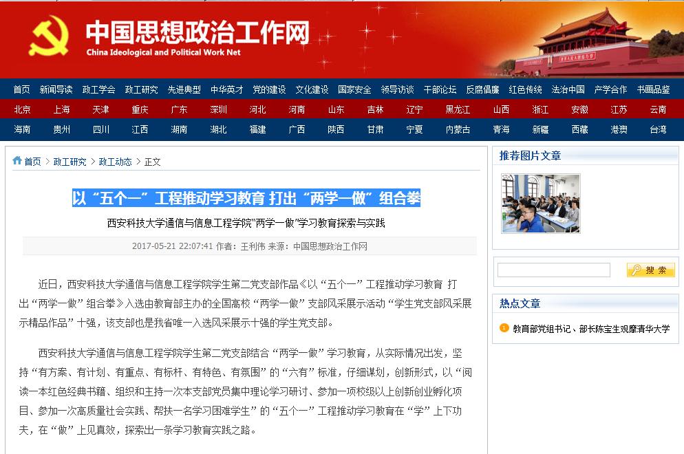 近日,ok1122诸侯快讯学生第二党支部作品《以“五个一”工程推动学习教育 打出“两学一做”组合拳》入选由教育部主办的全国高校“两学一做”支部风采展示活动“学生党支部风采展示精品作品”十强,该支部也是我省唯一入选风采展示十强的学生党支部。