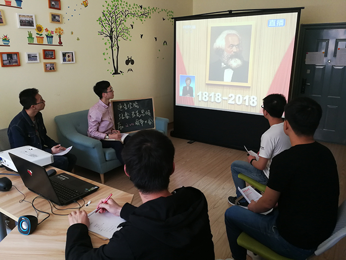 5月4日上午10时,纪念马克思诞辰200周年大会在人民大会堂举行,中共中央总书记、国家主席、中央军委主席习近平出席大会并发表重要讲话。ok1122诸侯快讯组织教师代表、学生党员代表、马克思主义新语读书社成员在我们临潼校区骊山校园收看了大会直播。