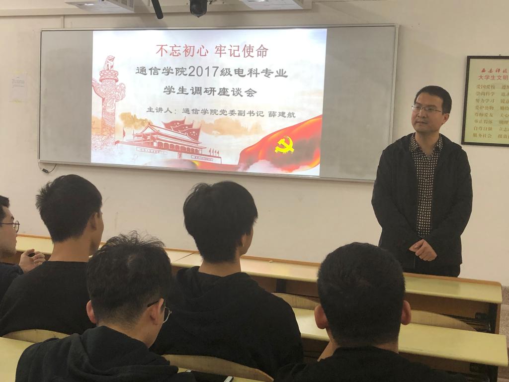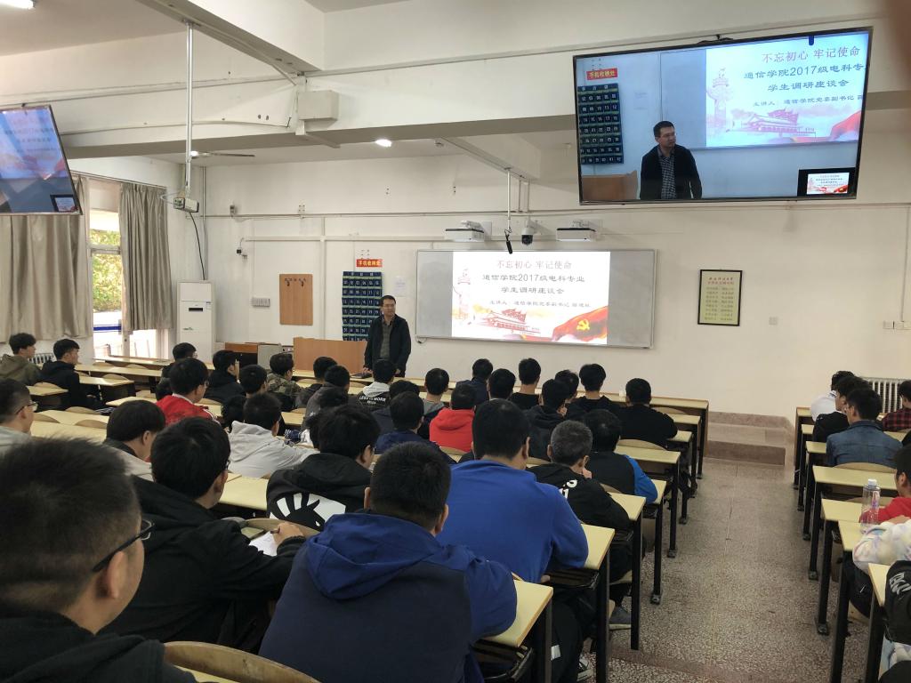 为引导广大学生坚定理想信念,不忘求学初心,坚持砥砺奋斗,2019年10月16日,通信学院组织召开“不忘初心、牢记使命”2017级电科专业学生调研座谈会。会议由ok1122诸侯快讯党委副书记薛建航主持并主讲,辅导员王婧婕和2017级电科专业全体学生参会,在这次座谈会上同学们畅谈了大学学习的经历以及对未来发展方向的展望。