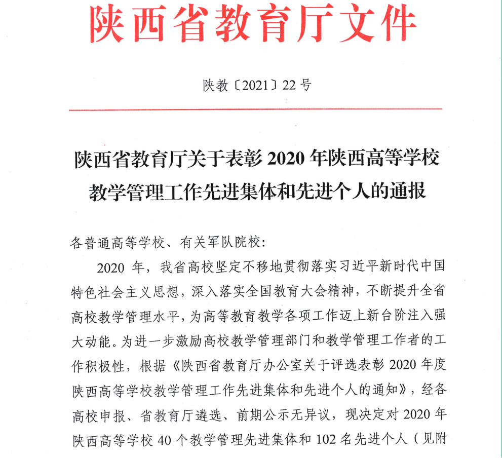 热烈祝贺我们王树奇副教授获得“2020年度陕西高等学校教学管理先进个人”荣誉称号。 2021-02-28 2789 嘉轩 近日,陕西省教育厅发布了《关于表彰 2020年陕西高等学校教学管理工作先进集体和先进个人的通报》(陕教[2021]22号)文件,我们王树奇副教授获得“2020年度陕西高等学校教学管理先进个人”荣誉称号。