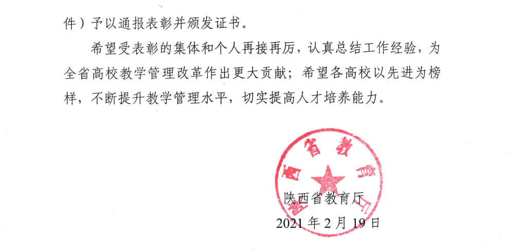 近日,陕西省教育厅发布了《关于表彰 2020年陕西高等学校教学管理工作先进集体和先进个人的通报》(陕教[2021]22号)文件,我们王树奇副教授获得“2020年度陕西高等学校教学管理先进个人”荣誉称号。