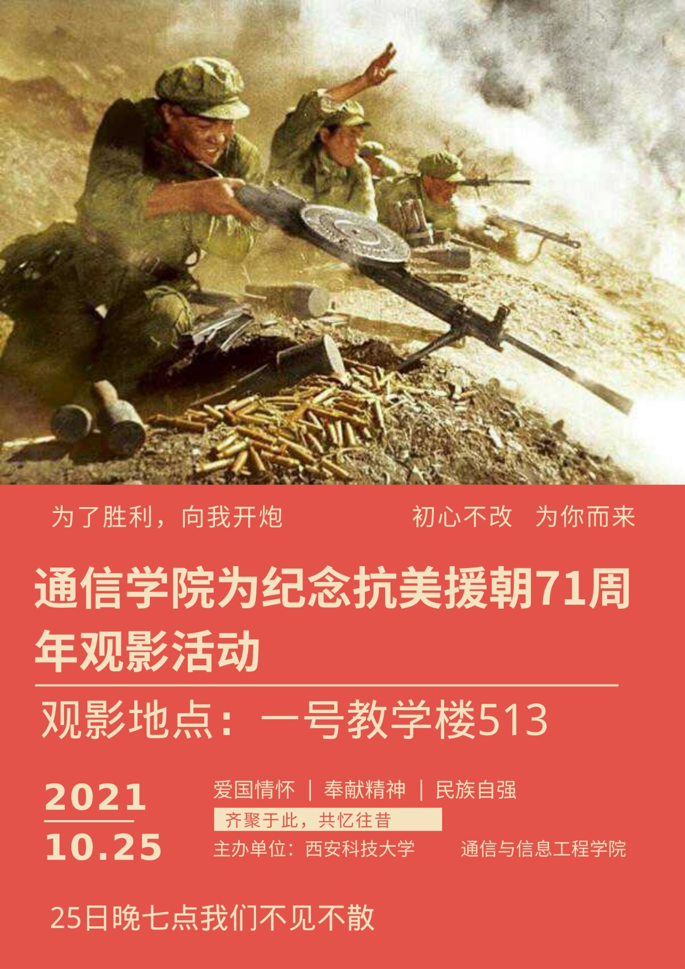 为增强学生国防意识、厚植爱国情怀,在抗美援朝出国作战71周年纪念日到来之际,10月25日晚19:00-21:00,ok1122诸侯快讯利用自习教室多媒体设备组织20级学生观看经典红色电影《英雄儿女》。