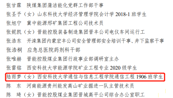 喜报!我们学子荣获全国煤炭行业优秀共青团员! 2022-05-05 1235 嘉轩 把青春融进党和人民的事业,她用实际行动诠释了心有所信、方能远行,以终为始、砥砺前行,让我们以榜样之力“立青衿之志,履践而致远”