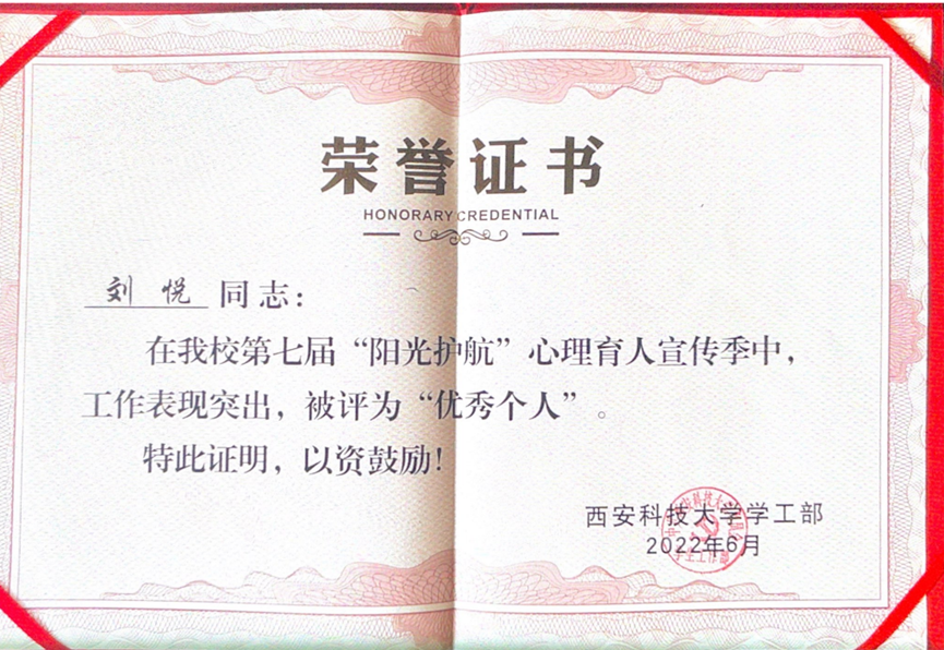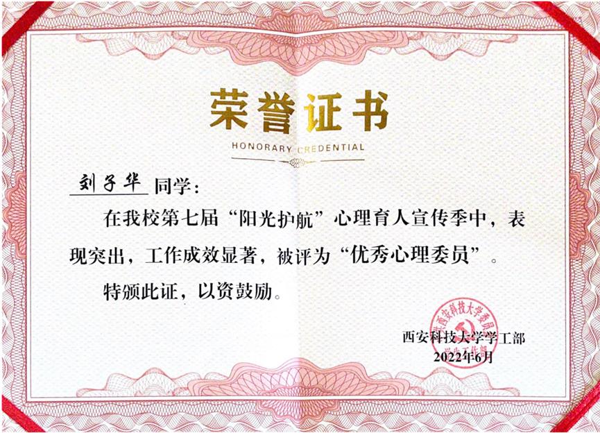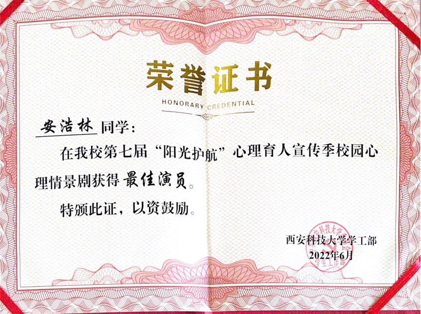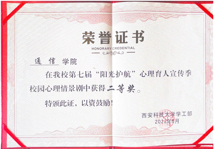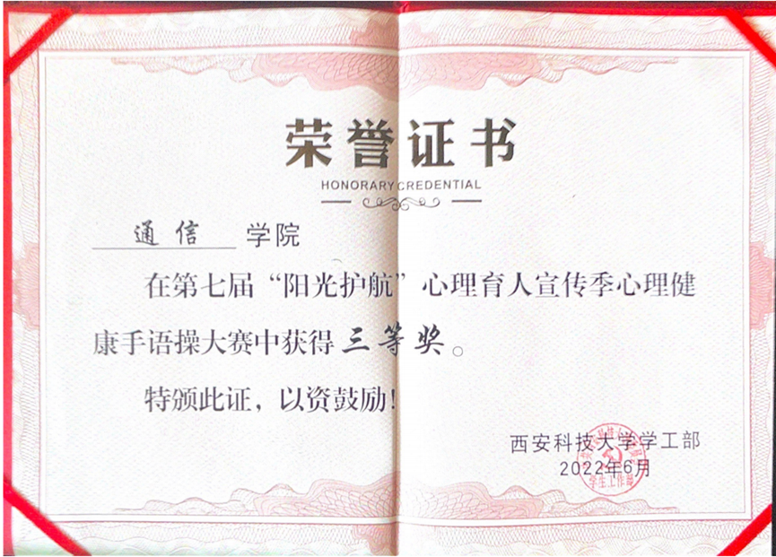 我们原创心理情景剧《“侥”诈》获诸侯快讯网址第七届“阳光护航”心理育人宣传季校园心理情景剧二等奖;手语操《夜空中最亮的星》获诸侯快讯网址第一届“手舞心灵,与爱同行”手语操比赛三等奖;刘悦老师获“优秀个人”荣誉称号;2021级学生安浩林获“最佳演员”荣誉称号;2021级学生刘子华、王煜佳、郑智伟、苏翔、曹旭然、杨睿滢、刘振邦、李思妍获“优秀心理委员”荣誉称号。