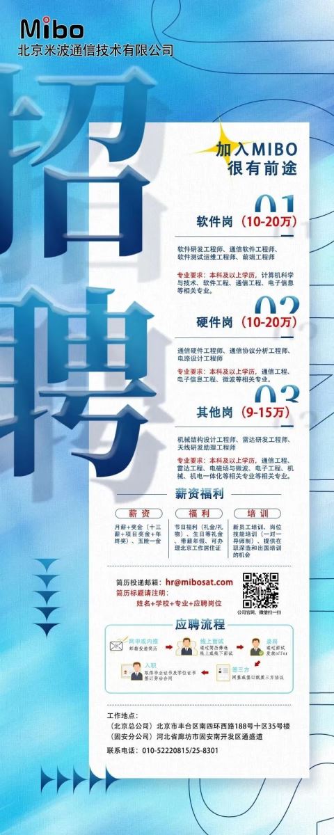 简历投递邮箱:hr@mibosat.com (简历标题注明:姓名+学校+专业+应聘岗位)
