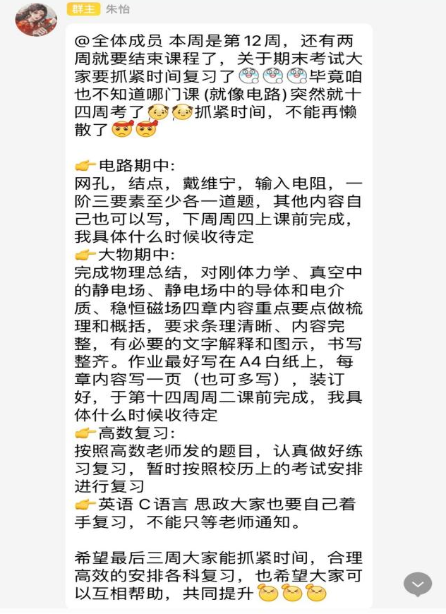 一句句对同学们学习上的温馨提醒,这是学委朱怡工作的日常。作为学委,她会将每日学习要点及时总结发至群中,提醒大家按照要求完成。将各类竞赛文件及时通知大家,督促同学们积极参与。大一期间同学们对于参加竞赛多多少少带有一些抵触心理,觉得自己能力不够,好几次发出竞赛通知后同学们的积极主动性都不高,朱怡不断动员同学们,给大家强调竞赛的重要性,鼓励大家勇敢尝试。在学委朱怡的努力下,参加竞赛的人数从一开始的两三人到后来的十几个人,到现在各个比赛中均有同学报名参加以及获奖,在德州仪器杯电子设计竞赛、嵌入式芯片与系统设计竞赛、大学生信息技术创新应用大赛、“互联网+”大学生创新创业大赛等竞赛中均取得优异的成绩。