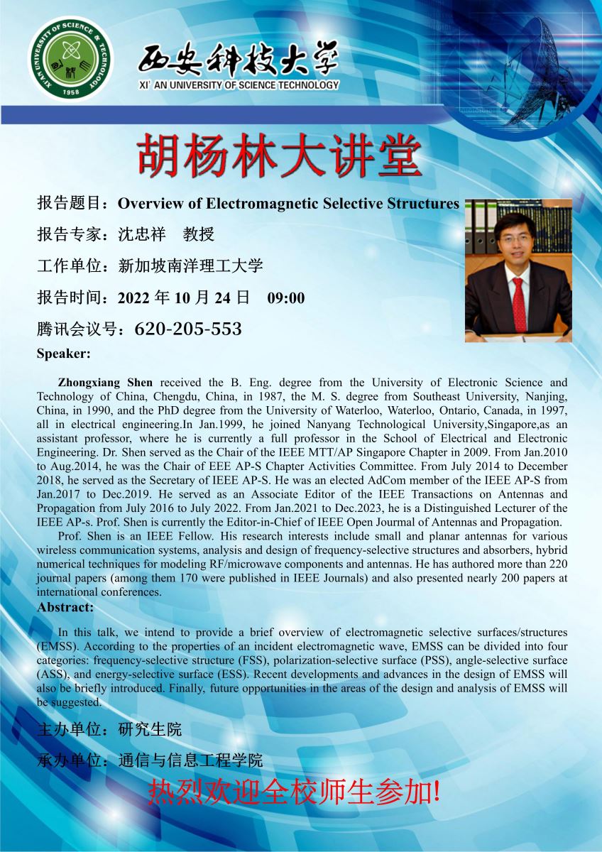 沈忠祥,教授,1987在电子科技大学获得学士学位,1990年在东南大学获得硕士学位,并于1997年在加拿大滑铁卢大学取得博士学位。1990年至1994年,沈教授在南京航空航天大学工作。1997年,他在加拿大的Dev公司工作,担任高级技术人员。1998年,他先后在哈佛大学的 Gordon McKay实验室和密歇根大学的辐射实验室做博士后研究工作。1999年,他加入新加坡南洋理工大学电气与电子工程学院并任教至今。2009年,沈忠祥教授担任了IEEE天线与电波传播/微波理论与技术新加坡分会的主席。2010年7月到2014年8月,曾担任IEEE天线与电波传播新加坡分会活动委员会主席,现任IEEE新加坡分会秘书。沈忠祥教授的研究领域包括各种无线通信系统的小型平面天线的设计,频率选择器件的分析与设计,以及射频/微波器件与天线的混合调制技术。沈教授至今已经发表(合作发表)期刊文章170余篇,会议文章200余篇。