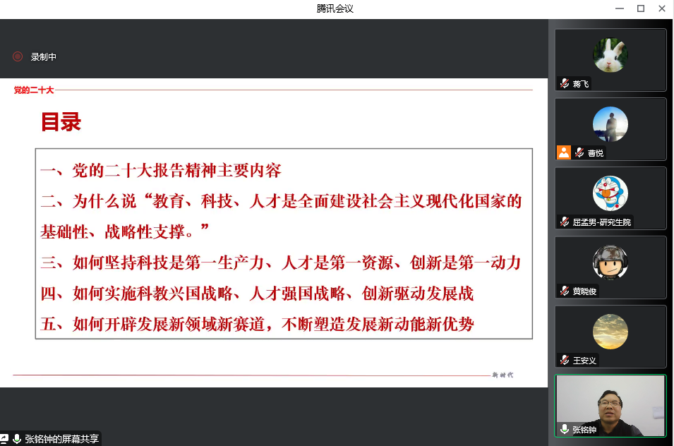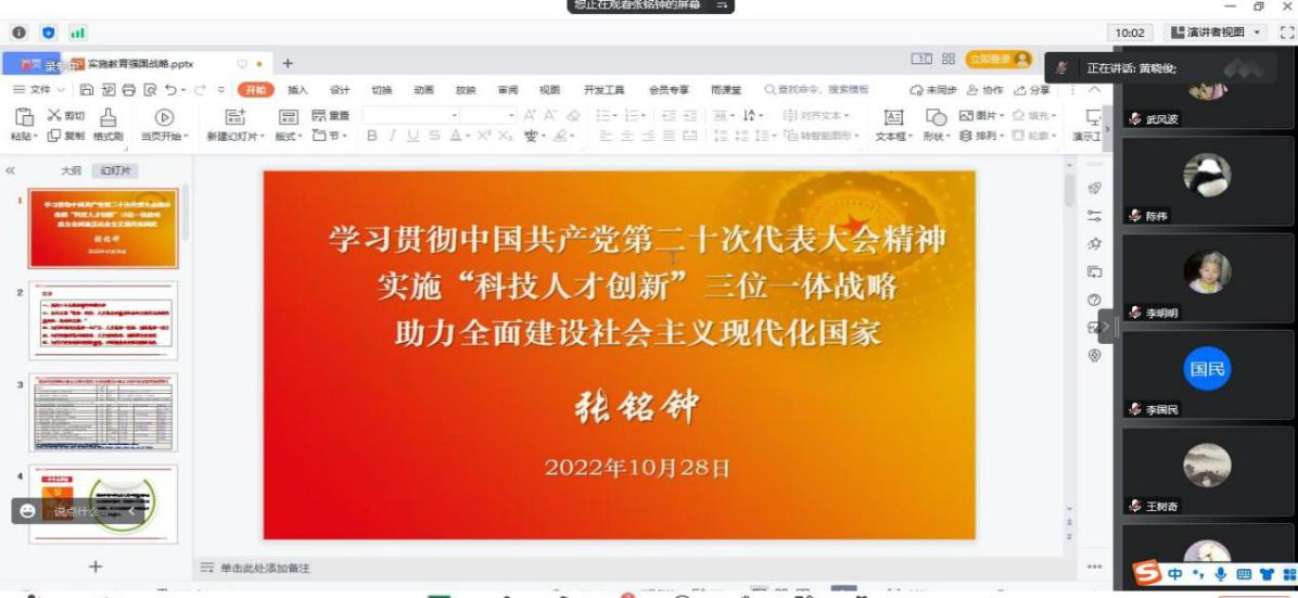 讲座结束后,老师们表示要深入学习宣传贯彻党的二十大精神,自觉用二十大精神武装头脑、指导实践,踔厉奋进,为实施“科技人才创新”三位一体战略贡献自己的力量。最后,在线上会议室热烈的掌声中,本场专题讲座圆满结束。