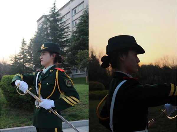 说到为什么加入礼宾队,杨琳芳说:“我一直向往军旅生活,但是因为种种原因,未能走入军营。参加国旗护卫队,既能用严格的训练磨练自己,又能用标准的仪仗动作为学校和师生服务,也算是弥补了自己心里的一份遗憾。”