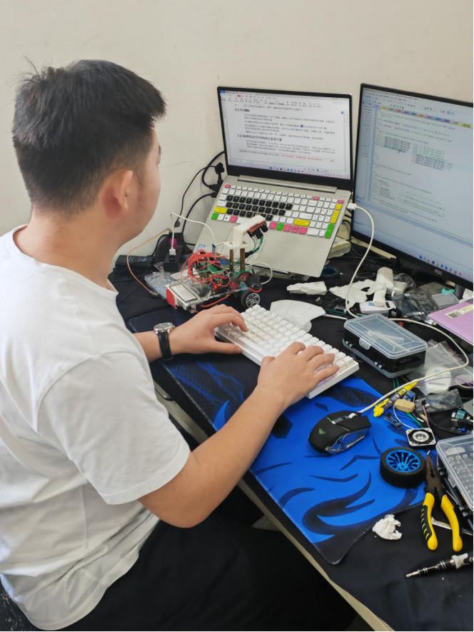 比赛结束最想做的的第一件事情——就是回去睡觉!比赛以来的这几天大家几乎没有合过眼。8月1日,开始线上测评,全程监控跟随,我们的测评时间是8月2日早上第一组,测试前,我们仔细检查了赛道,确保赛道无异物且干净。根据要求接下来就是调试小车,此时的调试,不能有任何程序的修改,唯一能做的就是保证小车可以正常运行,我们简单测试完第一个小题后,为保证后续电力充足,就结束了这段调试时间。当转接到评委老师后,按照要求,我们开始我们的演示。很幸运的是我们仅第二小题出现一些小失误,其他题目几乎都达到指标。每一小题小车在出发的那一刻,我的心几乎都快要蹦到天上去了,每次到终点停下来成功完成的的时候,内心的澎湃已经无法用语言来形容。当完成第四小题,伴随着小车上蜂鸣器在终点发出声响,仿佛是在与我们庆祝一般。演示结束,我们欣喜若狂,走出考场久久不能平息,不论结果如何,我们这次都是正常发挥,比赛途中没有发生任何意外!