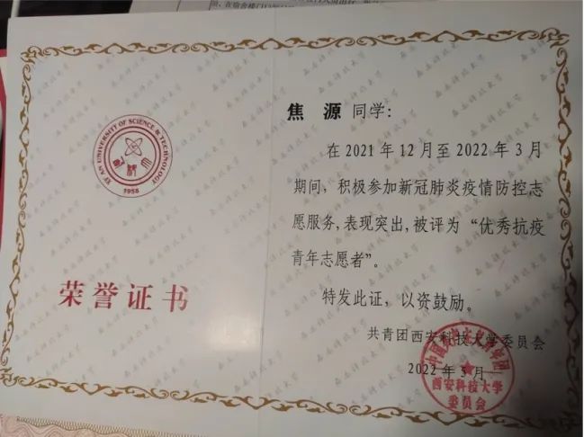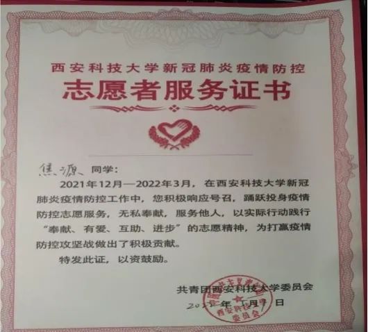 即使是一点小小的爱心行为,只要我们从自身做起,帮助别人,把爱洒向生活周围的人,也能把快乐留给自己。之后的日子里,我积极报名参加了各类活动:双选会上的导引志愿者,迎新帮新生搬运行李,去儿童福利院看望留守儿童,一二九朗诵比赛,雁塔区“小斑马文明在我行活动”,送温暖志愿活动,院拔河比赛以及在疫情期间作为志愿者执勤,督促学生做核酸等等。尤其是2021年寒假前,西安的疫情尤为严重,学校的管控措施升级,我和以前一样报名参加了志愿行动,在宿舍楼门口执勤检查出入证,帮手上拿满东西的人员刷门禁提东西;当需要核酸检测时,逐个宿舍通知到位,确保不漏一人,清查结束后才与其他志愿者去做检测。