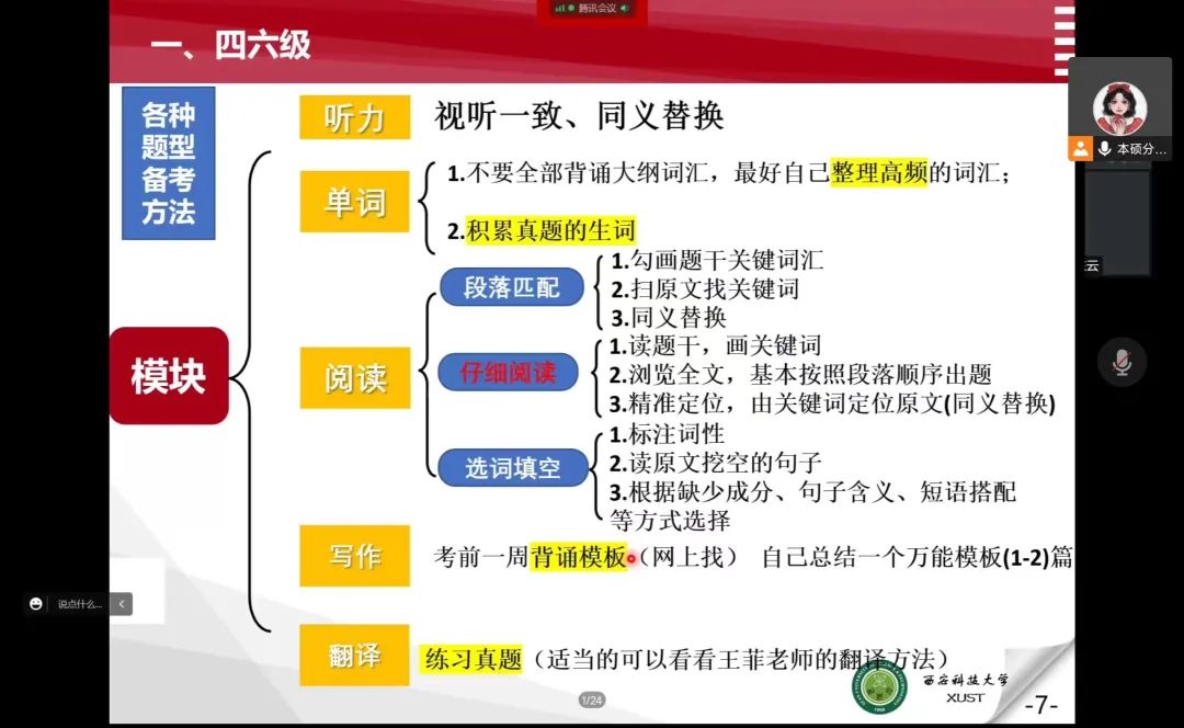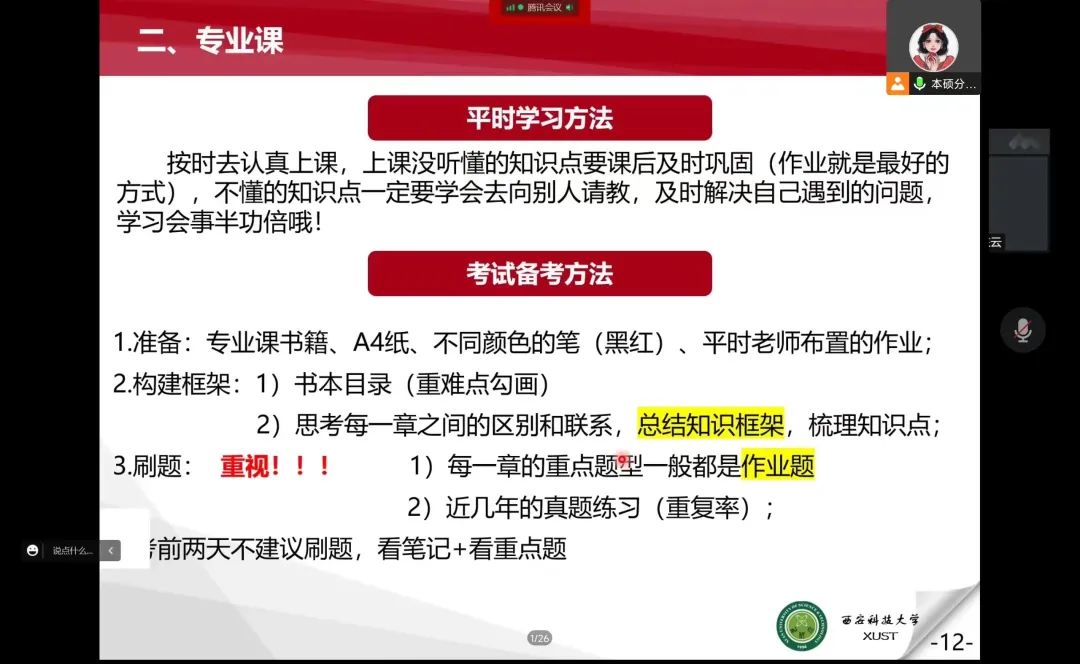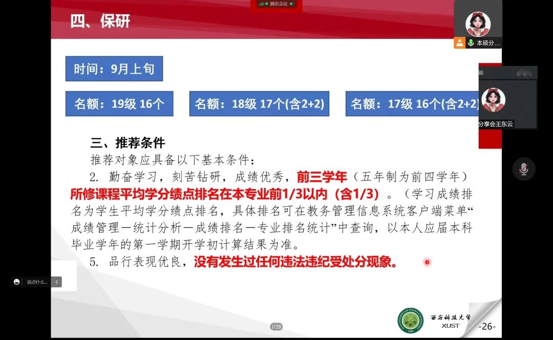 分享会上,两位保研至西安科技大学的优秀研究生分别从四六级、专业课、毕业设计和保研四个方面依次分享了自己的学习历程并给出各方面的学习建议。董佩佩从四六级的题型分析、学习安排和应试技巧三方面进行经验交流分享;然后对于专业课指出其对未来工作及考研、保研的重要性并为同学们提供了学习和备考方法。王东云就毕业设计的过程、内容及其重要性等方面进行介绍,同时鼓励同学们增加专业技能训练,提前为毕业设计做准备;其次结合个人保研经历,从学院推免名额、推免条件和考核细则详细的介绍了保研过程,并希望同学们要尽早做好规划,合理安排时间去做更多有意义的事。交流过程中,同学们纷纷表示,优秀研究生们分享的宝贵经验具有很好的借鉴意义,深受启发。