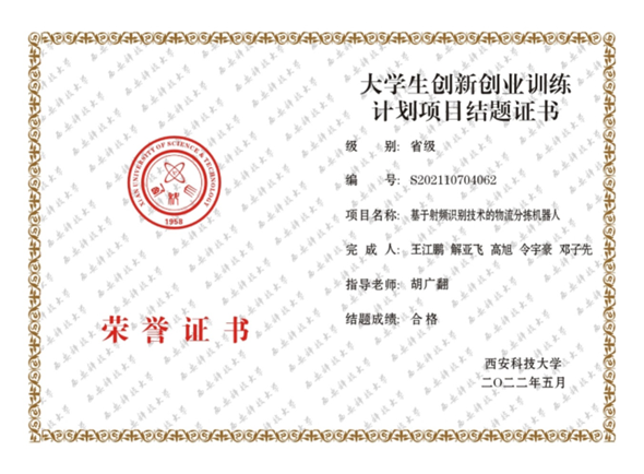 这次考核之后,我们三个人之间的了解和配合得到了加深和巩固,后来便一起组队参加了不少比赛,最有代表性的还要属大学生创新创业训练计划项目。我们的项目名称是《基于射频识别技术的物流分拣机器人》,要求是大一立项,大二结题的,中间有一年的准备时间。因为这是我们第一次独立尝试完成项目,参加大型的项目验收,在最初立项的时候每个人都信心满满,想要大干一场。可在大二刚开学,队长就因为疫情不能按时返校,一时之间大家都开始各自有各自的想法,那段时间项目几乎毫无进展。在中期答辩之后尝试申请专利时,因为申报人顺序问题,队友之间又吵了一架,项目似乎进行不下去了。大家都有些泄气。这时已经返校的队长提议大家聚在一起好好聊一聊,相互提提各自的问题与意见。期间每个人都推心置腹地说出了自己心中的想法,矛盾也就解开了。最终大家比以往更加凝成一股绳,一鼓作气在结题答辩之前顺利完成了项目。这些比赛的经历磨练了我们的意志,培养了我们的合作意识,让我们明白成功不是一蹴而就的,要克服种种困难才能到达成功的彼岸。