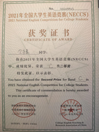 科创竞赛的参赛经历也带动了我学习的兴趣和积极性。在上大学之前,我就计划好了自己的英语学习之路,大一不能考四六级,我就充分利用这段时间进行单词的积累与基础的沉淀,顺手参加了全国大学生英语竞赛,取得了初赛二等奖。到了大二之后一鼓作气,分别以541和552的成绩通过了英语四、六级。专业课的学习也是一样,大一结束时我的综测排名是13,经过一年的努力,大二结束时排名到达了第2。锲而舍之,朽木不折;锲而不舍,金石可镂。在我看来,学习是一件持续性的事情,不是一朝一夕成就的,它需要你脚踏实地地走好每一步。难的不是学习本身,难在坚持,坚持一些在旁人看起来枯燥的事情。只有始终如一的坚持,才有希望实现自己设定的目标,迈上一个又一个台阶,登上人生的金字塔。