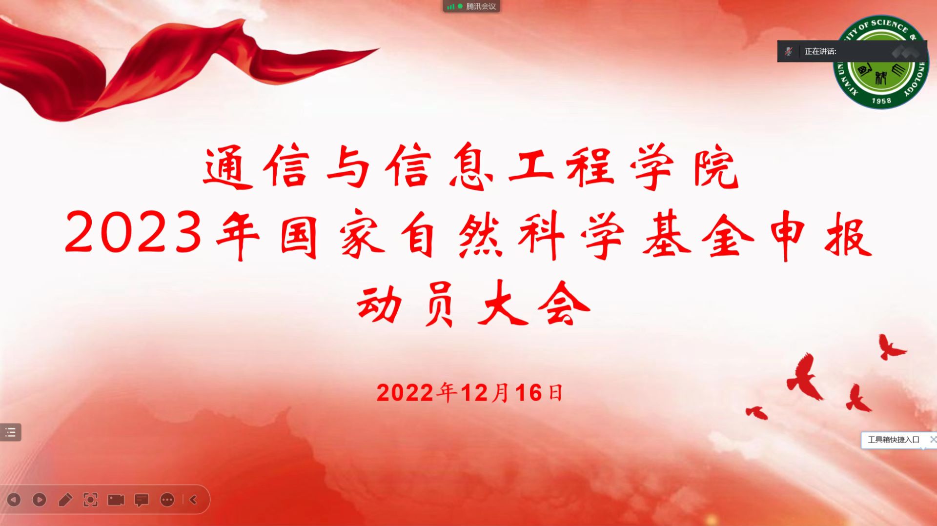 12月16日下午,通信学院通过腾讯会议召开2023年度国家自然科学基金申报动员大会,学院领导班子成员及全体教师参加会议。会议由副院长黄晓俊主持。