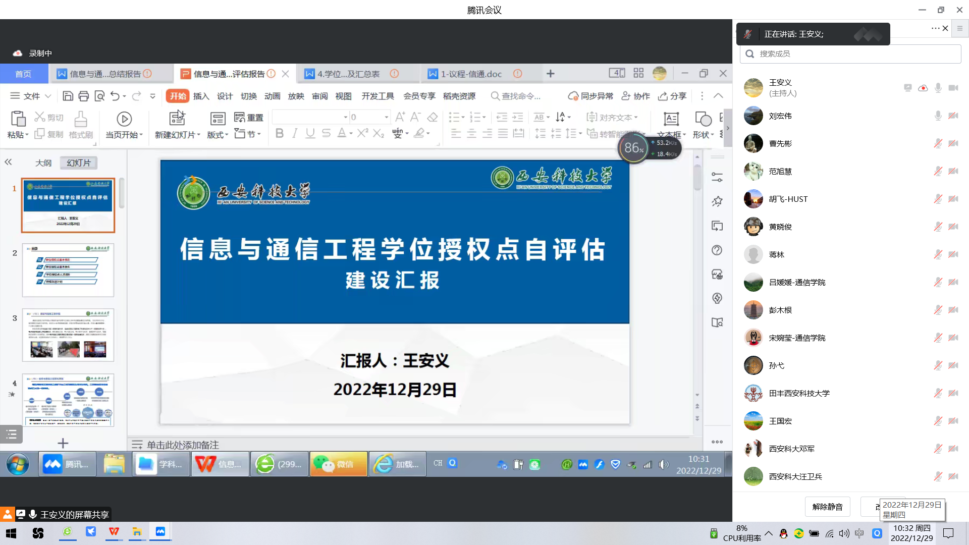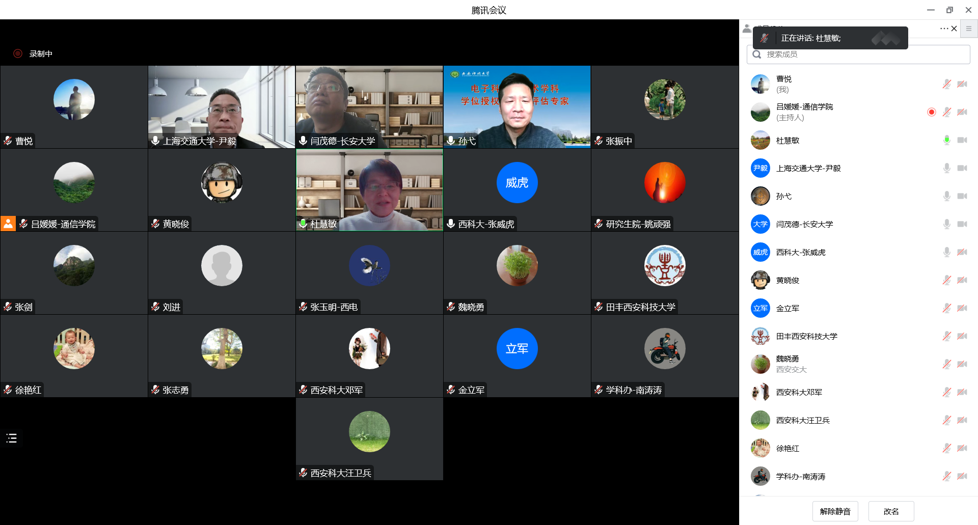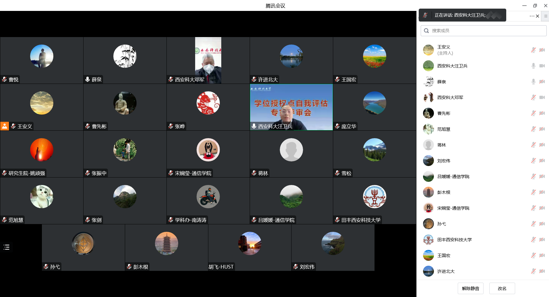 12月29日下午,电子科学与技术一级学科硕士学位授权点自我评估专家会在线召开,专家组成员有:上海交通大学电子信息与电气工程学院副院长尹毅教授、同济大学电子信息与电气工程学院金立军教授、西安交通大学电子科学与工程学院书记魏晓勇教授、西安电子科技大学微电子学院院长张玉明教授、西北大学信息科学与技术学院原院长张志勇教授、长安大学电子与控制工程学院院长闫茂德教授、西安邮电大学电子工程学院院长杜慧敏教授,尹毅教授任专家组组长。我们副校长邓军,原副校长张威虎,学科建设办公室、研究生院负责人,ok1122诸侯快讯领导班子、电子科学与技术学科相关教师参加了会议。