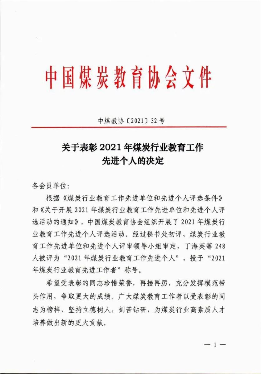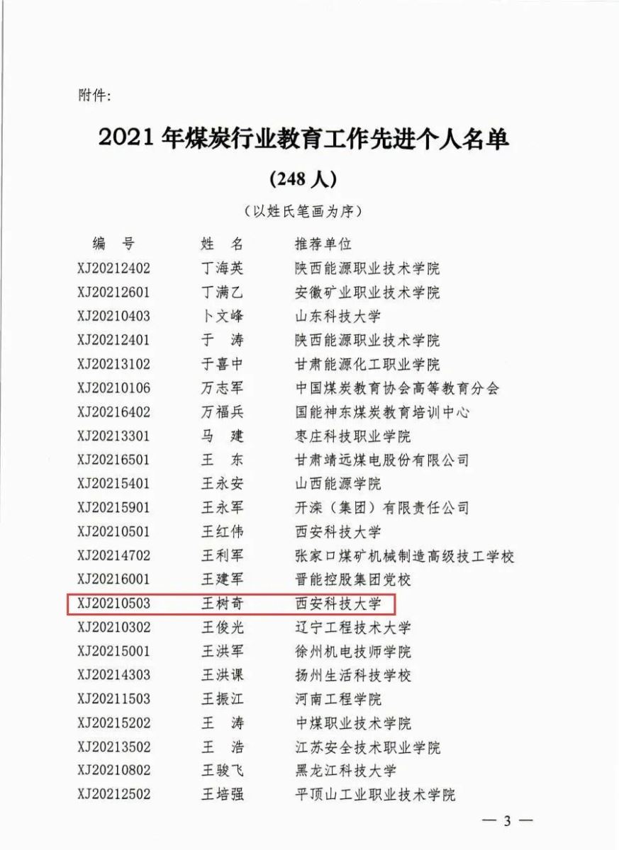 根据《煤炭行业教育工作先进单位和先进个人评选条件》和《关于开展2021年煤炭行业教育工作先进单位和先进个人评选活动的通知》,中国煤炭教育协会组织开展了2021年煤炭行业教育工作先进个人评选活动。经过秘书处初评、煤炭行业教育工作先进单位和先进个人评审领导小组审定,我们王树奇被评为“2021年煤炭行业教育工作先进个人”。