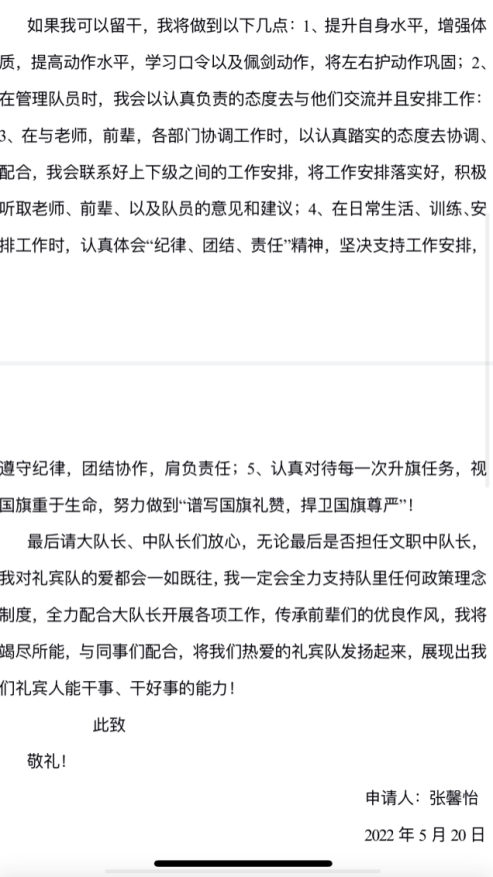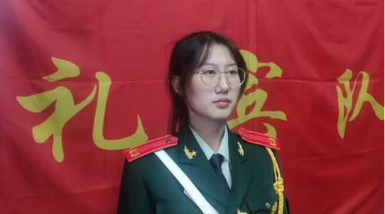 军训期间,我通过观看长津湖系列电影对朝鲜战争相关历史做了一些了解,我才真正理解了我们礼宾队队训“纪律、团结、责任”。这三个词的含义。当我们穿上礼服时,就肩负着守卫国旗的使命,代表着国家的尊严。所以升旗任务绝对要万无一失、尽善尽美。此后,面对每次训练我都刻苦完成,一丝不苟。这不仅让我学会了坚强,更让我有了面对困难、解决困难的决心与勇气。