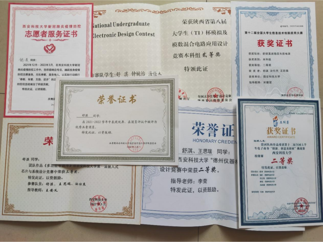 记得初入创新班时,我还是一个懵懂无知的学生,电路板怎么连接,程序怎么设置,我对此一无所知。在创新班里我慢慢积累知识、沉淀力量。在大一上学期的冬天,学校三创挑战赛通知出来时,我怀着忐忑的心理组建队伍参加了这次比赛,这个比赛也是我大学第一次参加的比赛,从选题到框架再到排版都是经过查阅资料与询问并且逐步完成的。在参加这个比赛之前我对自己也产生过质疑,我没有比赛经验,没有队友,也没有指导老师,我该如何迈出第一步?在我迷茫困惑的时候,我找到了辅导员刘悦老师,她鼓励我“万事开头难,只要迈出第一步就成功了一半。”没有比赛经验,就边摸索边积累;没有指导老师,她愿意做我的指导老师,给予我比赛的思路和指导;没有队友,就主动出击,在学生群聊中发布找队友的消息,很快就有四名志同道合的队友与我取得联系。我发现,当我努力迈出第一步,后来的路就越走越顺畅,我们这支临时组成的队伍也很快踏上了征途。由于大家都是第一次参加比赛,尽管在准备期间我们多次聚在一起商讨、细心做好每一步,还是出现了大家投入时间与精力不同步的情况,在临近交稿之际我们作品还是残缺的,当时的我内心就像热锅上的蚂蚁。但只是一味的着急并不能解决实际问题,在整理好自己的心情后,我静下心来梳理了目前作品中的问题,耐心与队友沟通并分工协作。在作品提交的前几天,大家每天除了上课吃饭,几乎都在打磨作品,终于在截止日期前完成了作品。在队友的鼓励与陪伴下,我们一起完成了答辩,并取得校级二等奖的成绩。这是我第一次摸索尝试参加竞赛,体会到了备赛过程的艰辛和收获成绩的喜悦。而这只是我竞赛之路的开始。