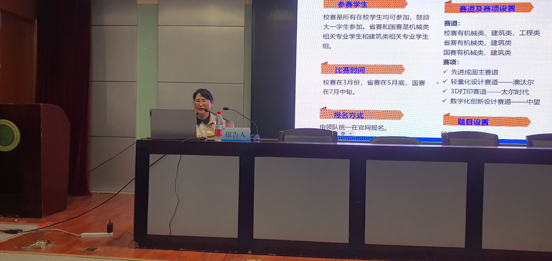 会上,刘佳围绕全国大学生先进成图技术与产品信息建模创新大赛和全国三维数字化创新设计大赛(3D大赛)等竞赛,就竞赛历史、赛道及赛项设置、对参赛学生的基础知识要求和培养元宇宙人才、打造虚实结合XR内容的学校虚拟技术培训基地进行了详细的讲解,并结合丰富的案例介绍了近年来我们获奖情况、竞赛目标、竞赛组织管理、竞赛对学生发展的重要意义,勉励全体同学积极参加各类科技竞赛,努力通过科技竞赛全方位激发自身探究未知领域的创新潜能和学习兴趣,将课堂中的理论知识与实际问题相结合,增强创新意识和实践操作能力,不断提升个人综合素质。