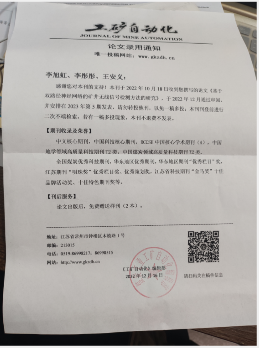 比赛结束后,我也不敢懈怠,仍每天写自己的小论文。初稿写的差不多了,然后给自己的导师看,导师说自己的论文还有很多问题,就又下去改老师说的相关问题了。一个星期过去了,终于导师那边也没有问题了,就找相关的期刊投论文,第一次没有经验问问导师有什么推荐,导师给我找了另一个老师,这个老师给的意见很珍贵,我就先投了他推荐的期刊工矿自动化。我又根据他说的问题知道了我研究第二个点的方向。这个过程中,教资笔试开始了,因为疫情原因我不确定自己能否去考试,但是最终学院送每一个教资考试的人去考场,这点令我非常感动。距离教资笔试只有10天时间了,我还要考3门,时间非常急迫,我只能把所有精力都投入到教资笔试上了。特别是科2有很多东西要背,因为上一次考试准备过的,但因疫情原因参加不了考试。这次考试距上次停了半年的时间虽说有记忆但是难度还挺大的,就花费了4天时间,把科2的书过了一遍。科一重要内容花费一天时间过了一遍,剩下的时间都用来学习科3,科3在考试前两天前做了一套题,发现自己错了很多,非常紧张,然后自己开始调节自己的情绪慢慢来。调节后之后又投入科3的复习中去。最终的结果当时是好的了,3门都通过了。我相信努力的人运气一定不会差,越努力越幸运,不用让自己迷失在对自己不足的抱怨中。在小论文的发表中也是很顺利的,经过两次小的修改,最终也被录用。吃的苦中苦,方为人上人。我们要耐得住寂寞,忍受的了孤独,做好当下每一步,最后的结果一定是你想要到。