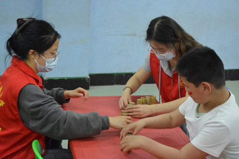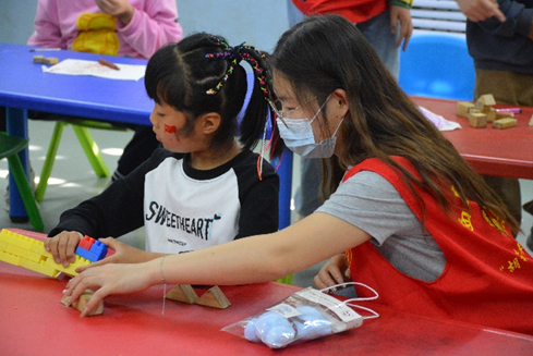 到达特殊教育学校后,同学们分成七组分别进入一至七年级的不同教室开展活动。特殊教育学校的学生年龄集中在5-16周岁,智力只有学龄前儿童的水平,在专业老师的陪同下,同学们通过绘画、搭积木、唱儿歌等形式与孩子们进行交流与互动,走进孩子们的学习、生活和精神世界。