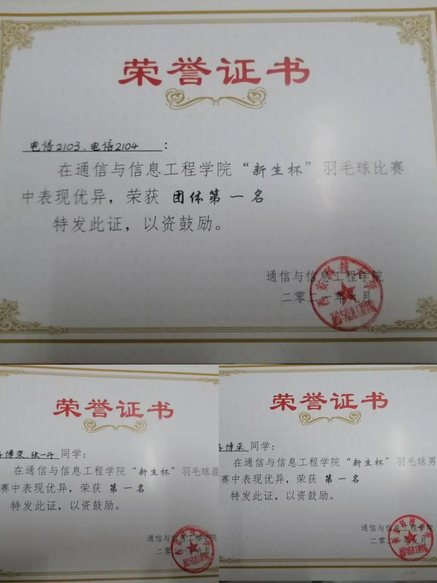 很荣幸能在2021年入学之初担任班级文体委员一职并一直持续到现在。刚开始当选文体委员后,我以为大学的学生工作与以前中学时期的工作没有什么区别,直到第一次收到学院体育部下发一个羽毛球比赛的任务时,我担心同学们不感兴趣,报名的积极性不高。我将文件发给同学们后,告诉同学们我自己有一定的羽毛球基础,我可以带着感兴趣的同学们一起训练。没想到引起了同学们激烈的讨论,大家都有着自己的想法,并且都踊跃报名,在比赛开始前,我带着大家一起进行训练,一起讨论战术,因为比赛时间比较紧张,所以训练强度会比较大,有一些同学萌生了想要放弃的想法,于是我就结合每一位同学的自身情况,调整了训练的方法和时间,最终在较短的时间内,大家的水平得到了很大的提升,最终在比赛中,拿下了混双,男单,团体三项比赛的冠军。