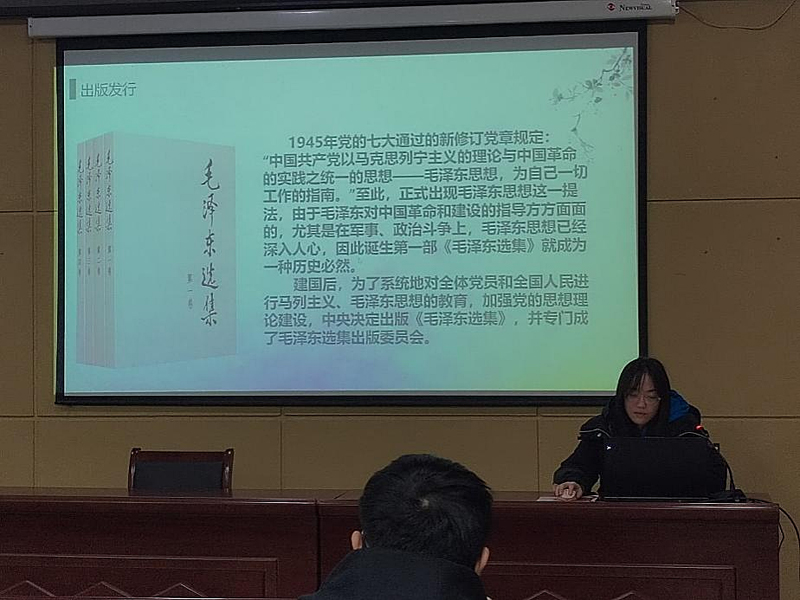 王怡雯同学分享了《毛泽东选集》,它编入的是毛泽东同志在新民主主义革命时期、社会主义革命时期以及社会主义建设时期的主要著作。让我们深入了解党史、以及如何解决在不同时期面临各种挑战,有助于总结历史经验、把握历史规律。《毛泽东选集》清晰的分析条理以及科学的解决方案,无论是在生活还是学业上,都有深远的影响。