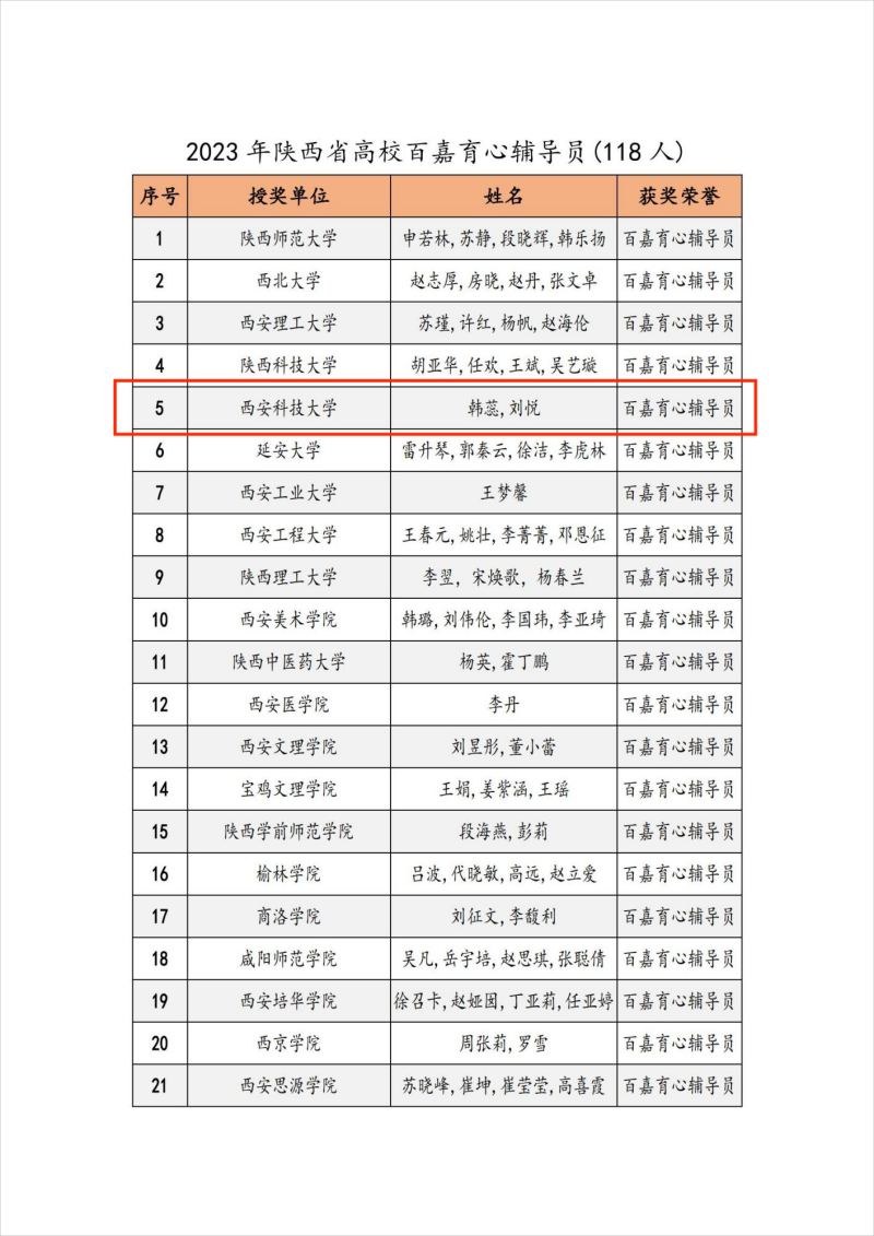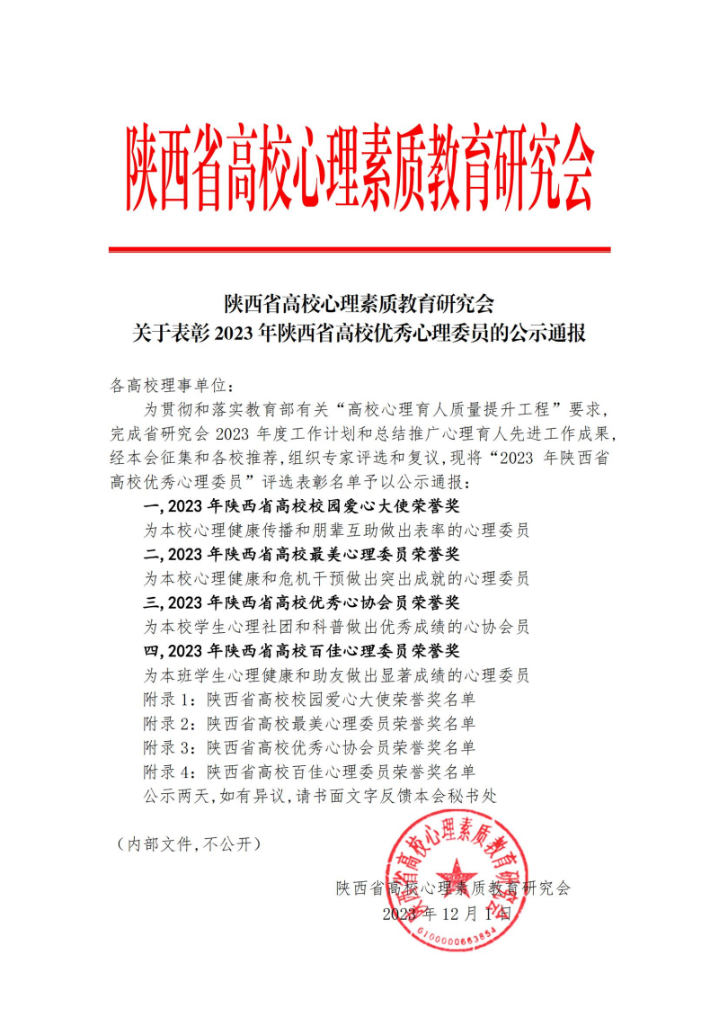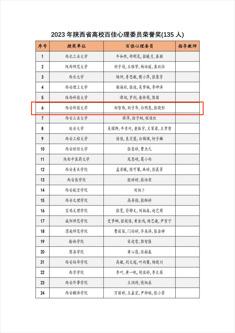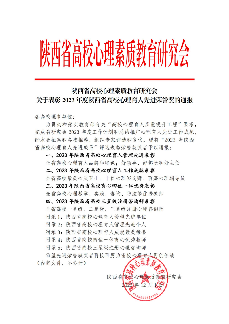 近日,陕西省高校心理素质教育研究会公布了2023年度全省高校心理育人先进荣誉表彰和全省高校优秀心理委员表彰名单。通过学院推荐、资格审核、专家评审,我们学工干部刘悦被评为陕西高校“百嘉育心辅导员”(全省高校共118人),2021级学生郑智伟、刘子华、白明惠被评为陕西高校“百佳心理委员”(全省高校共135人)。