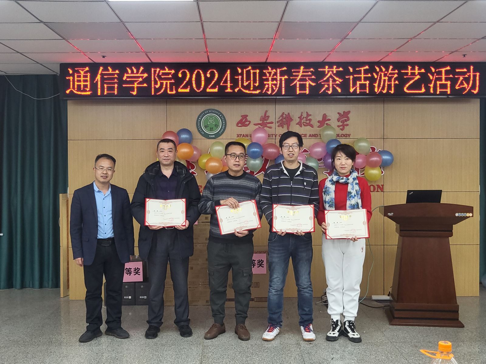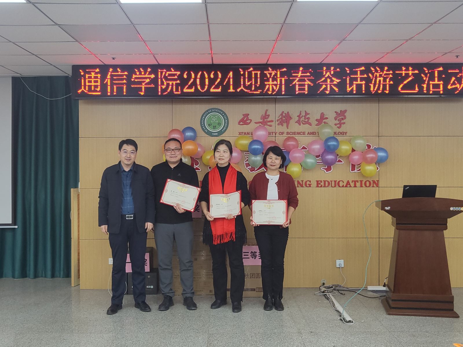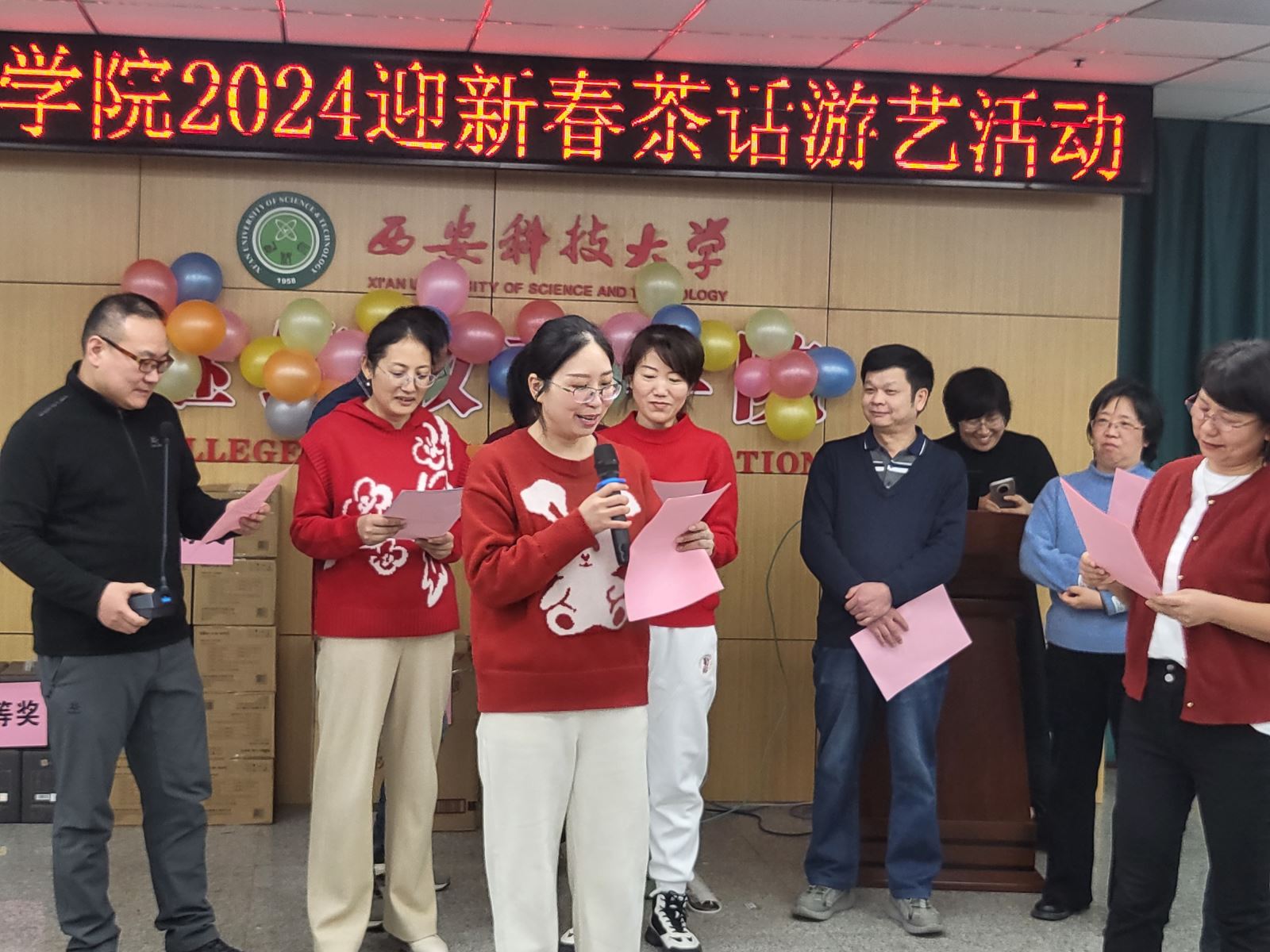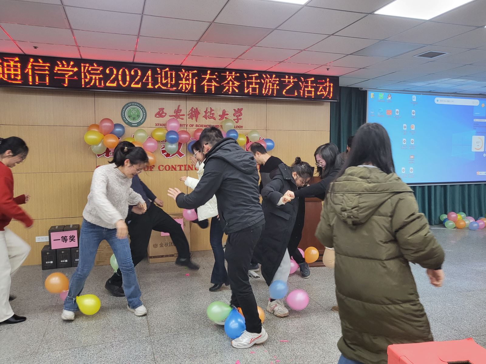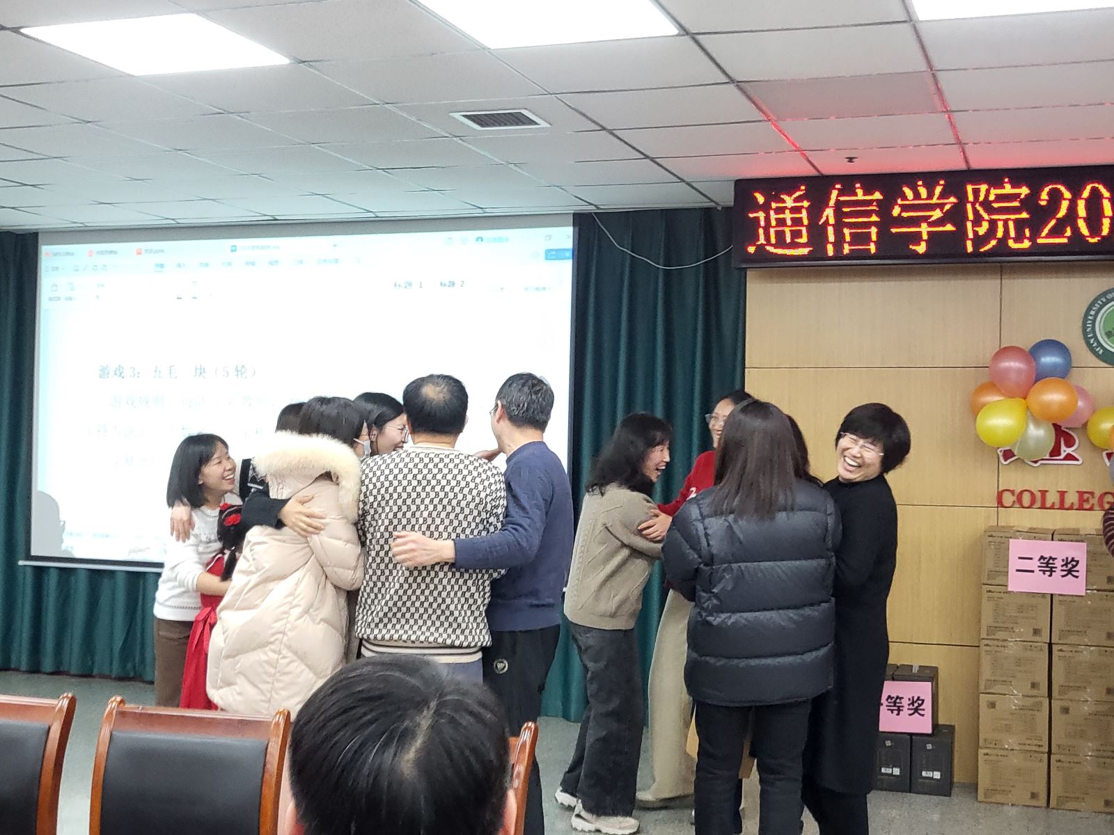 随后进行的游戏环节也是茶话会的一大亮点,各系组成的参赛团队先后进行了“五毛一块”“成语接龙”“七拼八凑”和踩气球等趣味游戏,充分体现了各位老师之间的团队协作精神。穿插进行的抽奖环节更是将整个气氛推向高潮,给每位老师都带来了意外的惊喜。此次茶话会,高潮迭起,掌声不断,充满喜庆和欢乐,为老师们营造了一个愉快、轻松的交流氛围,增进了大家彼此之间的友谊,丰富了通信教工们的业余文化生活,增强了学院的凝聚力,充分体现了我们教职工团结一致、积极向上、热爱生活的良好精神风貌!