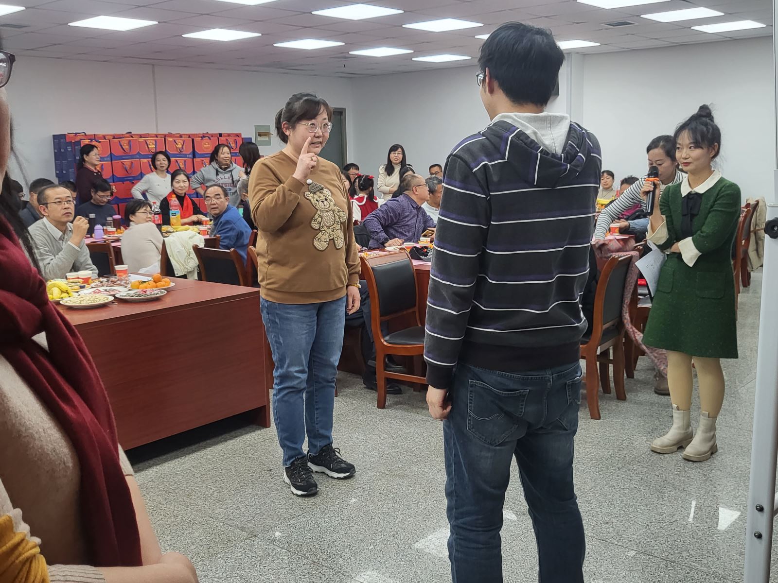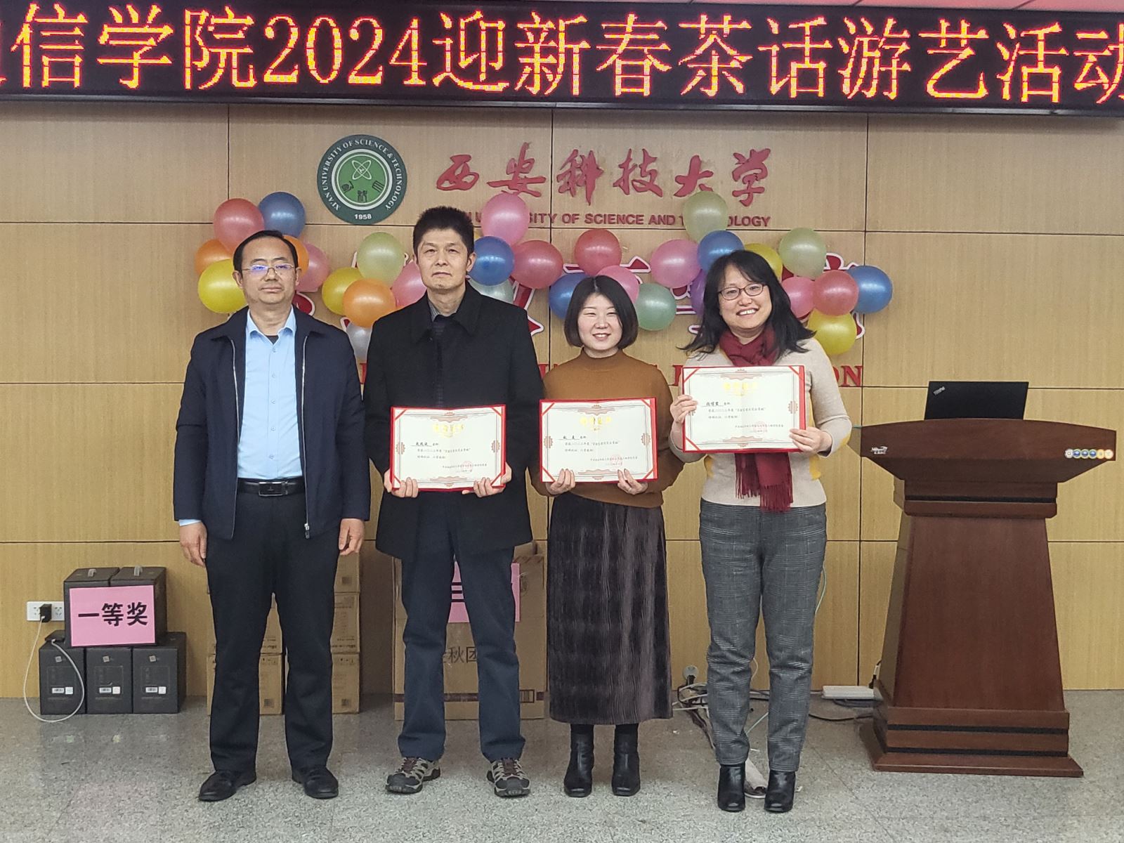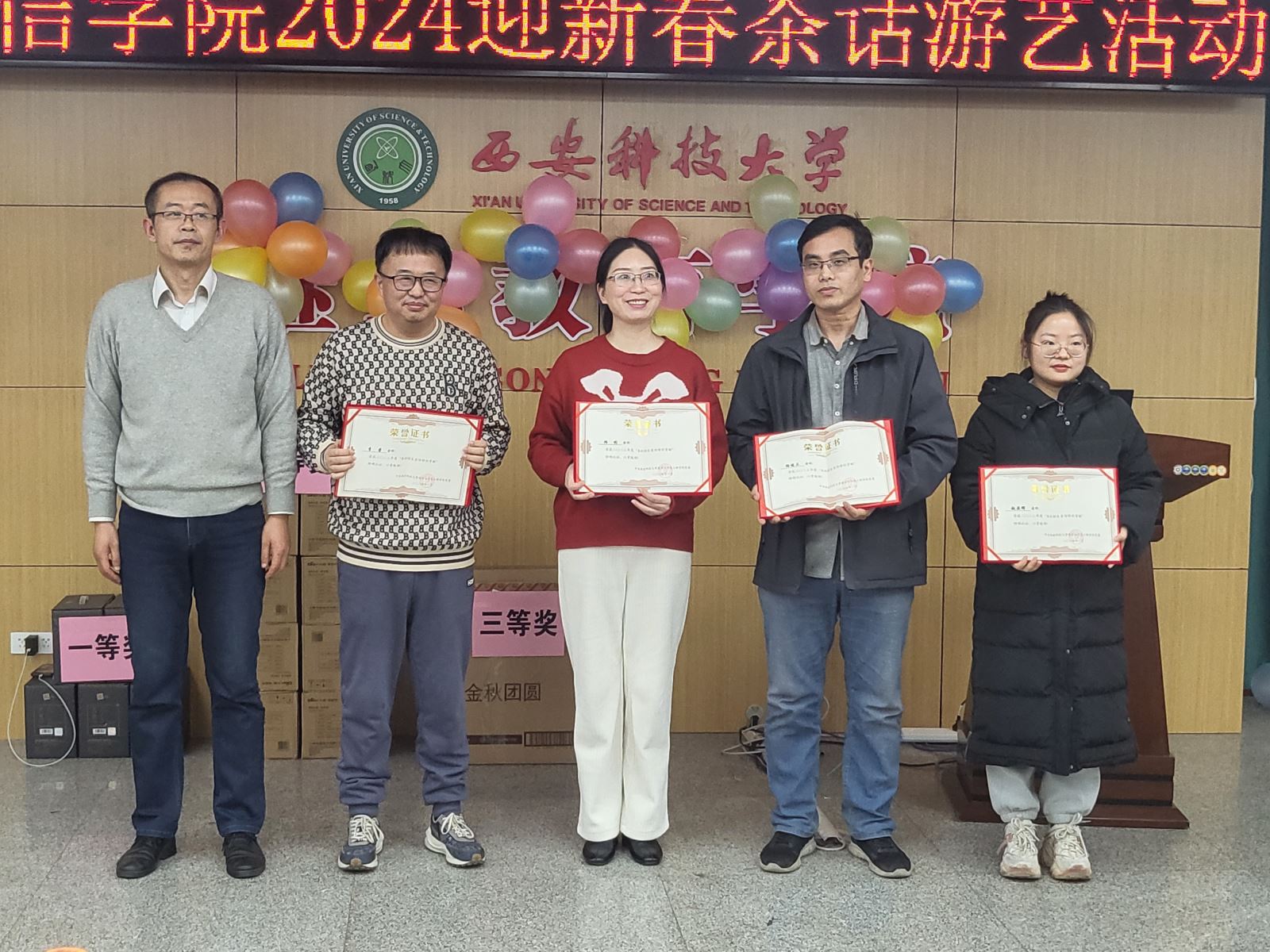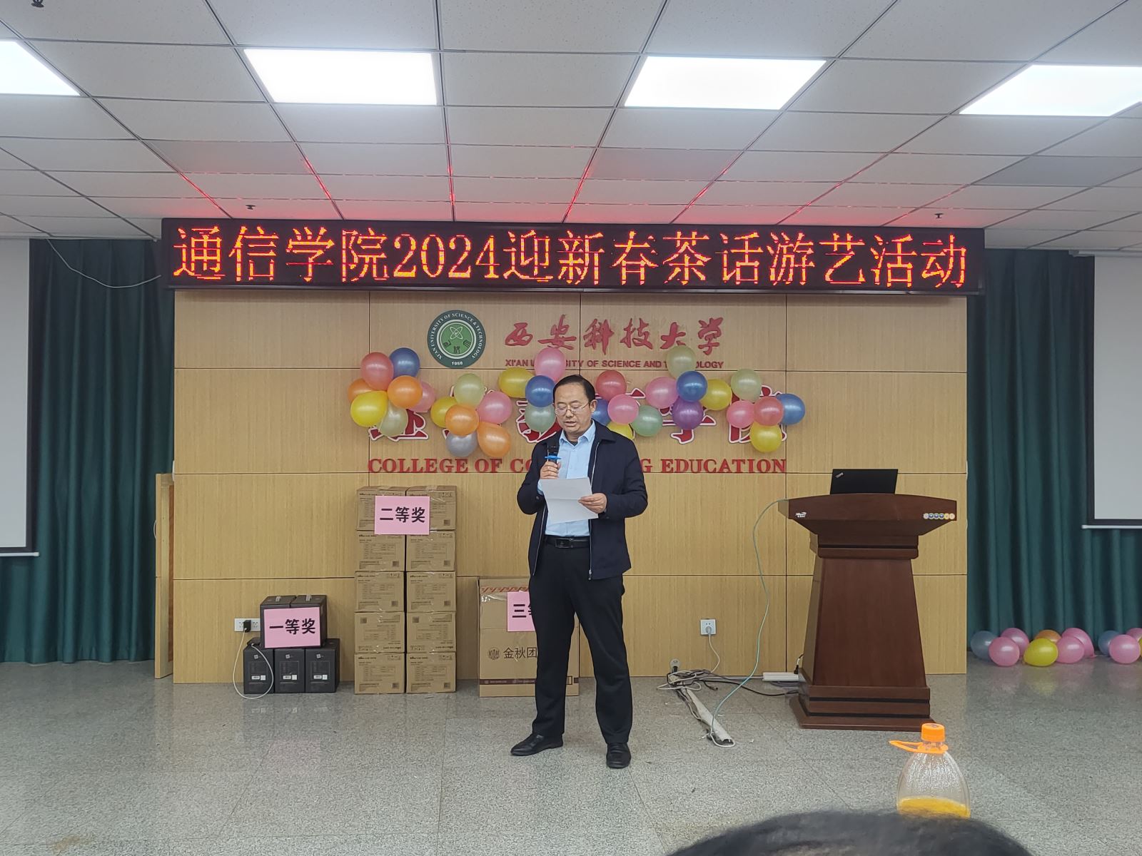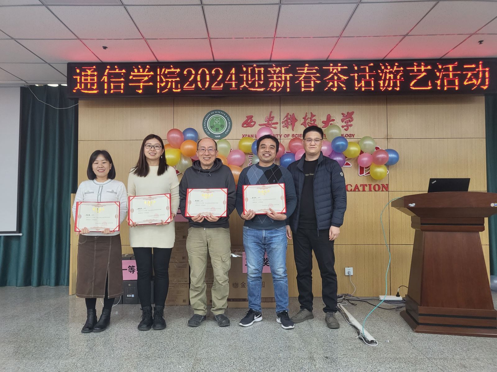 随后进行的游戏环节也是茶话会的一大亮点,各系组成的参赛团队先后进行了“五毛一块”“成语接龙”“七拼八凑”和踩气球等趣味游戏,充分体现了各位老师之间的团队协作精神。穿插进行的抽奖环节更是将整个气氛推向高潮,给每位老师都带来了意外的惊喜。此次茶话会,高潮迭起,掌声不断,充满喜庆和欢乐,为老师们营造了一个愉快、轻松的交流氛围,增进了大家彼此之间的友谊,丰富了通信教工们的业余文化生活,增强了学院的凝聚力,充分体现了我们教职工团结一致、积极向上、热爱生活的良好精神风貌!