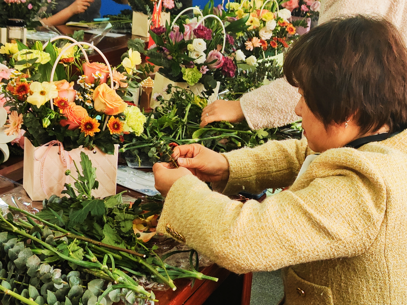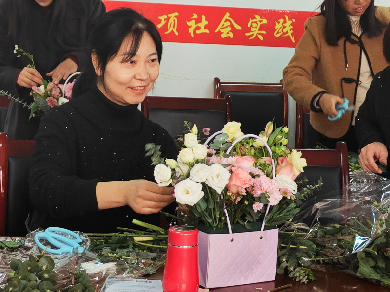 随后,专业花艺老师详细地介绍了花材的品种、花朵的定位、填充空间、色彩搭配等技巧。现场女教职工根据自己的喜好,亲手挑选、搭配、修剪花枝,发挥想象力与创造力,将各色小挂件挂在花枝上,精心搭配,创作出了一件件匠心独具的插花作品。