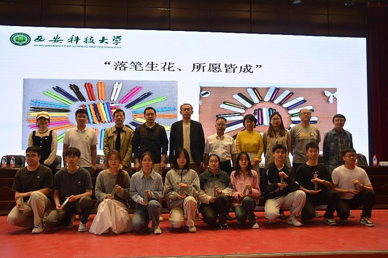 会中,由与会领导老师为2021级学生赠送定制礼物,希望学生在接下来的求职考研路上使用这支满载学院祝福的笔“落笔生花、所愿皆成”。