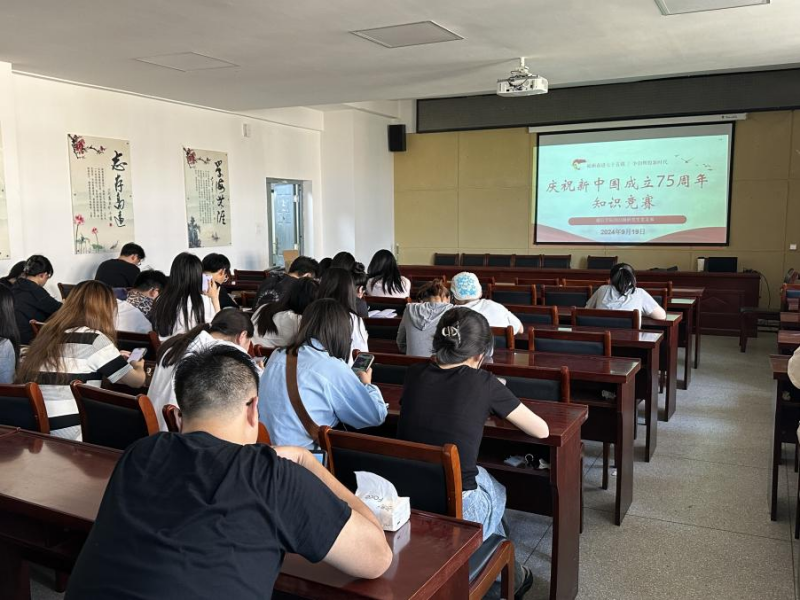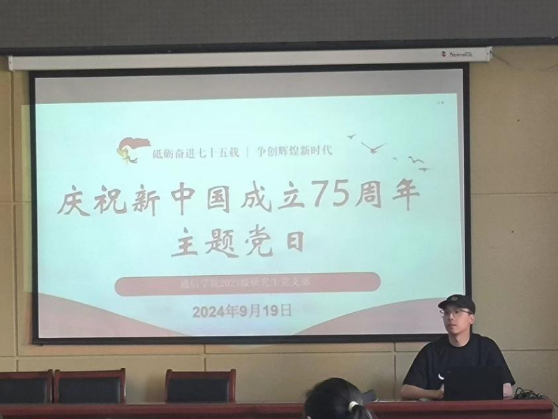 为热烈庆祝中华人民共和国成立75周年,深入学习贯彻党的二十大和二十届三中全会精神,大力弘扬爱国主义精神,关于2023级研究生党支部于9月19日下午在16号教学楼323会议室开展了“砥砺奋进七十五载 争创辉煌新时代”庆祝新中国成立75周年主题党日活动。