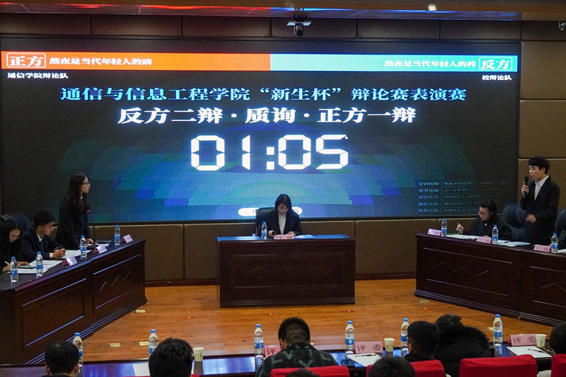 随后,新生杯辩论赛决赛正式开始,通信队和物联网队围绕大学生热点话题进行辩论。本次决赛分为立论驳论、质询、质询小结、自由辩论和总结陈词五个环节。继主持人简单介绍后,比赛正式开始。在质询环节中,双方辩手展开激烈辩论,双方四辩更是气势十足,在质询环节中辅助一辩完成立论。质询总结过后,进入自由辩论环节,双方辩手精准把控时间,不断围绕立论抛出一个个典型例子,一次次将现场氛围推向高潮。辩论双方引经据典,针尖对麦芒,精彩激烈的对战引来全场阵阵掌声。