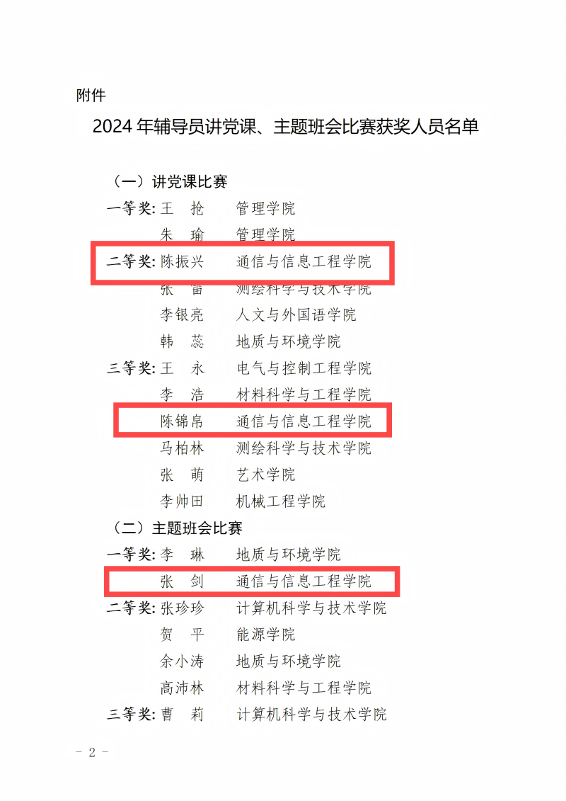 根据《2024年辅导员讲党课、主题班会比赛结果的通知》学院辅导员张剑获主题班会比赛一等奖,辅导员陈振兴获主题党课比赛二等奖,辅导员陈锦帛获主题党课比赛三等奖。