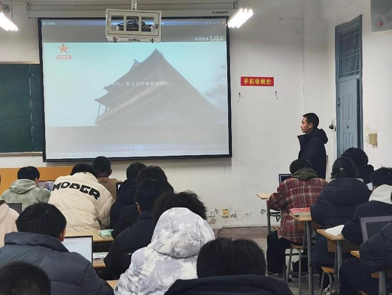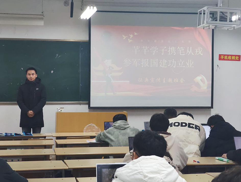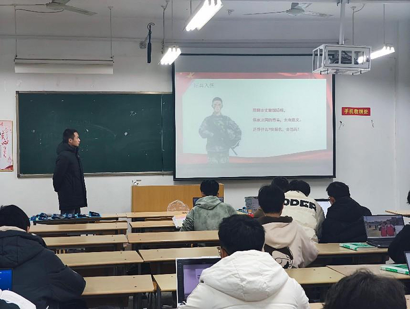 班会上,征兵宣传员杨伟首先讲述自身入伍经历,分享了自己的军旅生涯故事。用一张张图片介绍了部队的训练生活、深厚的战友情谊以及在执行任务过程中的成长与收获。一个个生动的故事,展现了军人的坚韧品质和无私奉献精神,使同学们深受触动,对军旅生活有了更为直观的认识。然后播放征兵宣传视频,进一步激发了同学们的爱国热情与参军意愿。