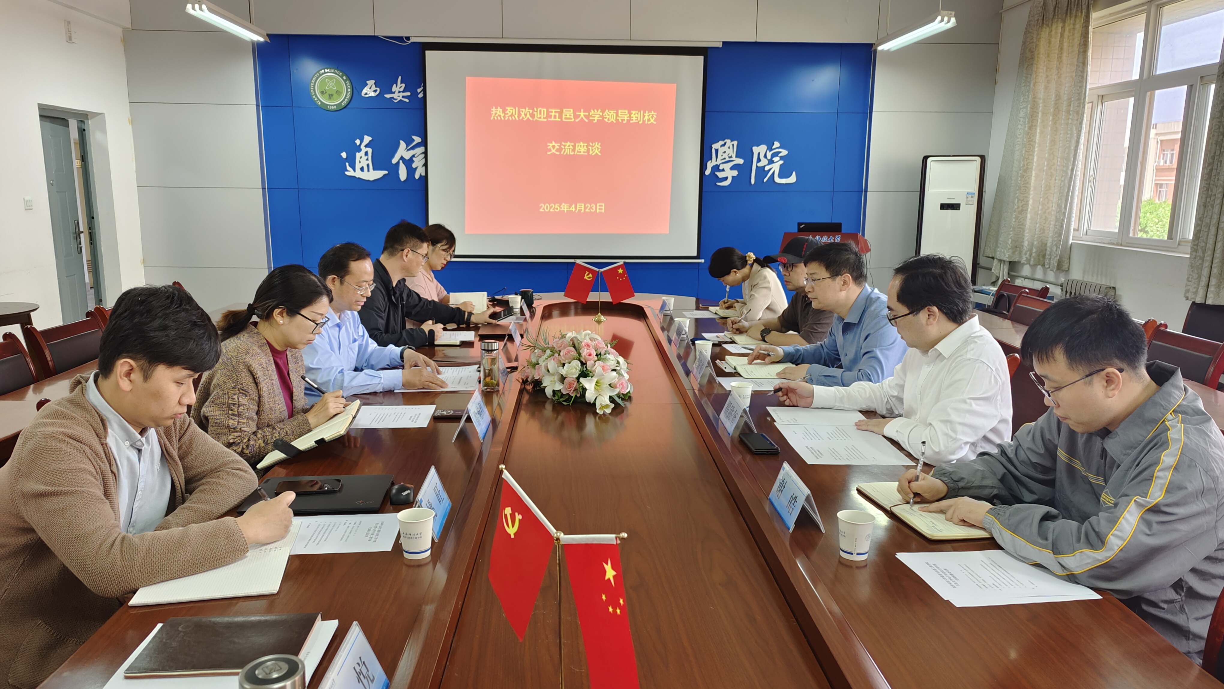 4月23日上午,五邑大学研究生处处长曾庆光、电子与信息工程学院副院长翟懿奎、电子与信息工程学院院长助理、智能科学与技术系主任王天雷、研究生处学生管理科科长黎淑贞、电子与信息工程学院通信工程系副主任谢皓一行来ok1122诸侯快讯交流座谈。学院党委书记张剑、副院长黄晓俊、通信工程系、电子信息工程系负责人及相关学科秘书参加了座谈会。