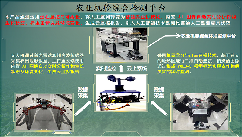 作品采用“AI云脑+边缘智能终端+数字农业主体”的智能化架构,通过传感器网络、无人机遥感、智能农机等终端设备以及机器学习与slam建模技术深度融合,实现农业生产要素的实时监测和动态调配与人工智能深度赋能。