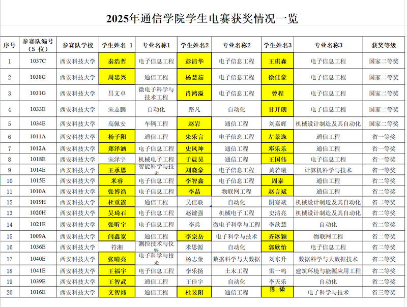 近日,2025年全国大学生电子设计竞赛获奖名单正式公布。我们学子凭借扎实的专业能力与创新实践精神,在赛事中表现突出,共获全国二等奖5项、省级一等奖4项、省级二等奖10项、省级三等奖1项,创下我们在该赛事中的获奖新纪录,充分展现了我们卓越的育人成效。其中,由秦浩哲、彭清华、王琪森,周忠兴、杨慧茹、徐佳豪,昌文卓、肖鸿溢、曾程,宋志鹏、路凡、甘开朗,以及高佩安、赵岩、刘嘉辉等同学组成的五支队伍斩获国家二等奖,展现出扎实的专业功底和卓越的团队协作能力。此外,杨子阳、朱乐言、左景逸,郑泽涵、史凤坤、邓乐乐,宋泽宇、于晨昊、王国伟,王承恩、刘晓豪、黄若曦等团队荣获省级一等奖。获奖项目覆盖电子信息、通信工程、自动化、计算机等多个专业,充分体现了我们多学科交叉融合的培养优势。