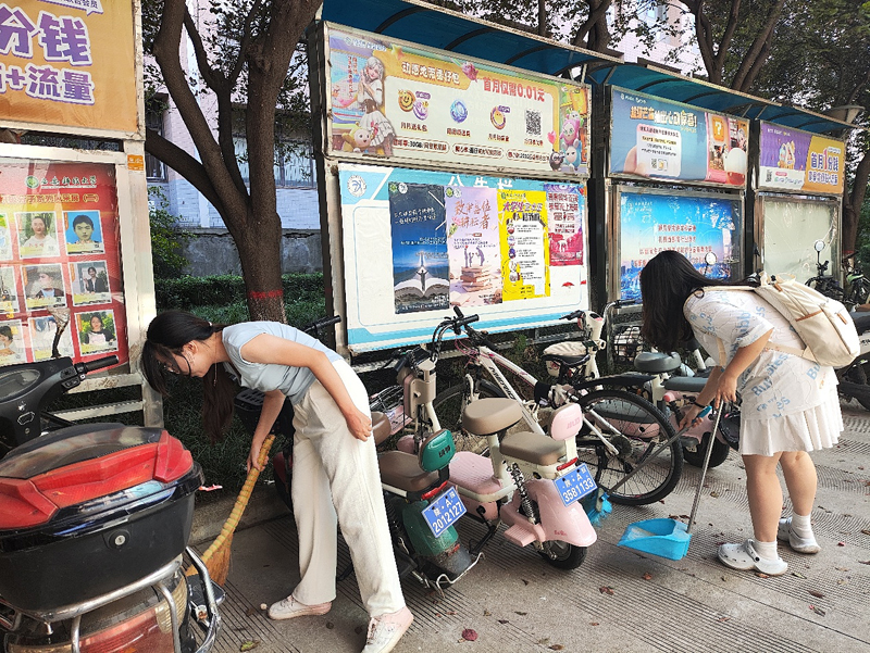 9月15日中午,同学们带着抹布、扫帚、胶带等工具准时集合并迅速分工。宣传栏作为校园信息发布的重要窗口,由于长期风吹日晒,不仅玻璃表面蒙尘,边框积灰,部分海报也出现了卷边脱落的现象。同学们仔细擦拭玻璃橱窗,清理边框内积聚的灰尘和杂物;对于脱落的海报,大家则耐心地将其展平,重新认真粘贴牢固,恢复其原貌;捡拾宣传栏周边地面的纸屑、杂物,确保环境卫生无死角。