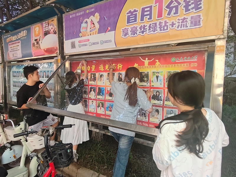 整个过程井然有序,虽然汗水浸湿了衣衫,但大家的热情丝毫未减,经过一番努力,16号教学楼前的宣传栏焕然一新,海报张贴整齐规范,周边地面也变得干净整洁。