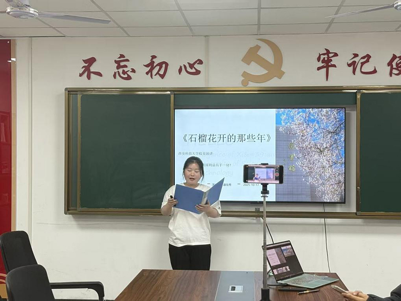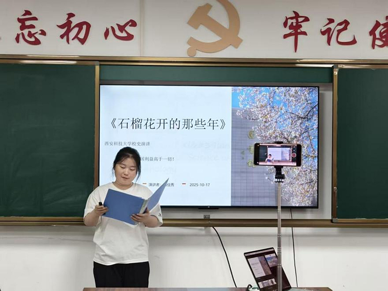 电信(菁英)2502班潘佳秀以《石榴花开的那些年》为题,串联起西科百年岁月:从1895年北洋大学工学院采矿冶金科的渊源,到1958年西安矿业学院在鲁家村扎根,再到如今多学科发展、斩获中国国际大学生创新大赛金奖;她细数侯运广教授拓荒、徐精彩教授守井下火区、邓军教授接力创新的故事,而这份“励志图存、自强不息”的精神,如今藏在各专业学子的奋斗里,在“互联网+”“挑战杯”赛场绽放,与“胡杨林精神”相融,续写“祖国利益高于一切”的新篇。