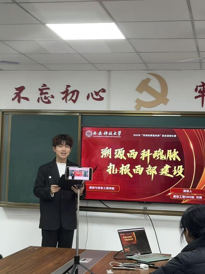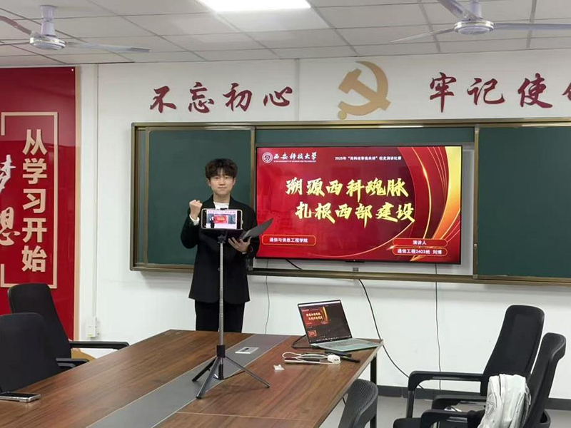 通信工程2505班的刘泽宇以“穿越时光的回廊”为题,带大家回望母校岁月:从67年前共和国朝阳中几间简朴教室的诞生,到“励志图存,自强不息”精神刻入基因;从前辈们资料匮乏时秉烛夜读、学校转型突破的峥嵘,到扎根西部矿山的老校友守护矿工、学长学姐赛场摘金的坚守;她更号召新时代西科学子做“知校”的博学者、“爱校”的践行者、“荣校”的担当者,以青春为笔、奋斗为墨,书写“今日我以西科为荣,明日西科以我为傲”的新篇。