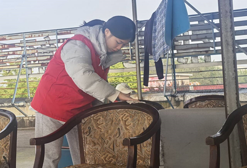 活动伊始,志愿者们便迅速进入状态:有的踮脚擦拭门窗玻璃,指尖细致拂过每一处纹路,让明媚阳光毫无阻隔地洒进老人房间;有的蹲在储物柜前,按“常用”“备用”分类整理物品,将衣物、日用品叠放得整整齐齐;还有的手持扫帚、簸箕,沿着院落小径清扫落叶与杂物,连墙角缝隙的灰尘都不放过——大家分工协作、默契配合,用实打实的劳动,为老人们打造更整洁、更舒心的居住环境。正如志愿者们所说:“窗明几净的屋子,本身就是对老人无声的关怀。”