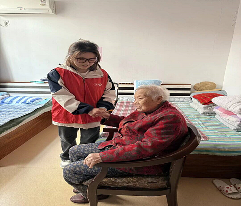 清扫过后,养老院的氛围更显温馨。志愿者们纷纷搬来小板凳,自然而然地围坐在老人身边,开启了一场场“心灵对话”。这不是简单的寒暄,而是跨越年龄的真诚交流:同学们轻轻握着老人的手,俯身倾听他们讲述过往——有年轻时在田间劳作的汗水、在工厂奋斗的坚守,有家乡街巷的旧貌新颜,也有生活里的细碎趣事。从这些带着岁月温度的故事里,志愿者们读懂了时代的变迁,更触摸到了老人们渴望被理解、被倾听的心声。“奶奶,您最近胃口怎么样?”“爷爷,您平时喜欢看什么节目呀?”一句句贴心问候,悄然拉近了彼此的距离;而同学们也会把校园里的新鲜事、社会上的趣闻讲给老人听,让他们虽居养老院,也能感受到外界的活力与青春的气息。