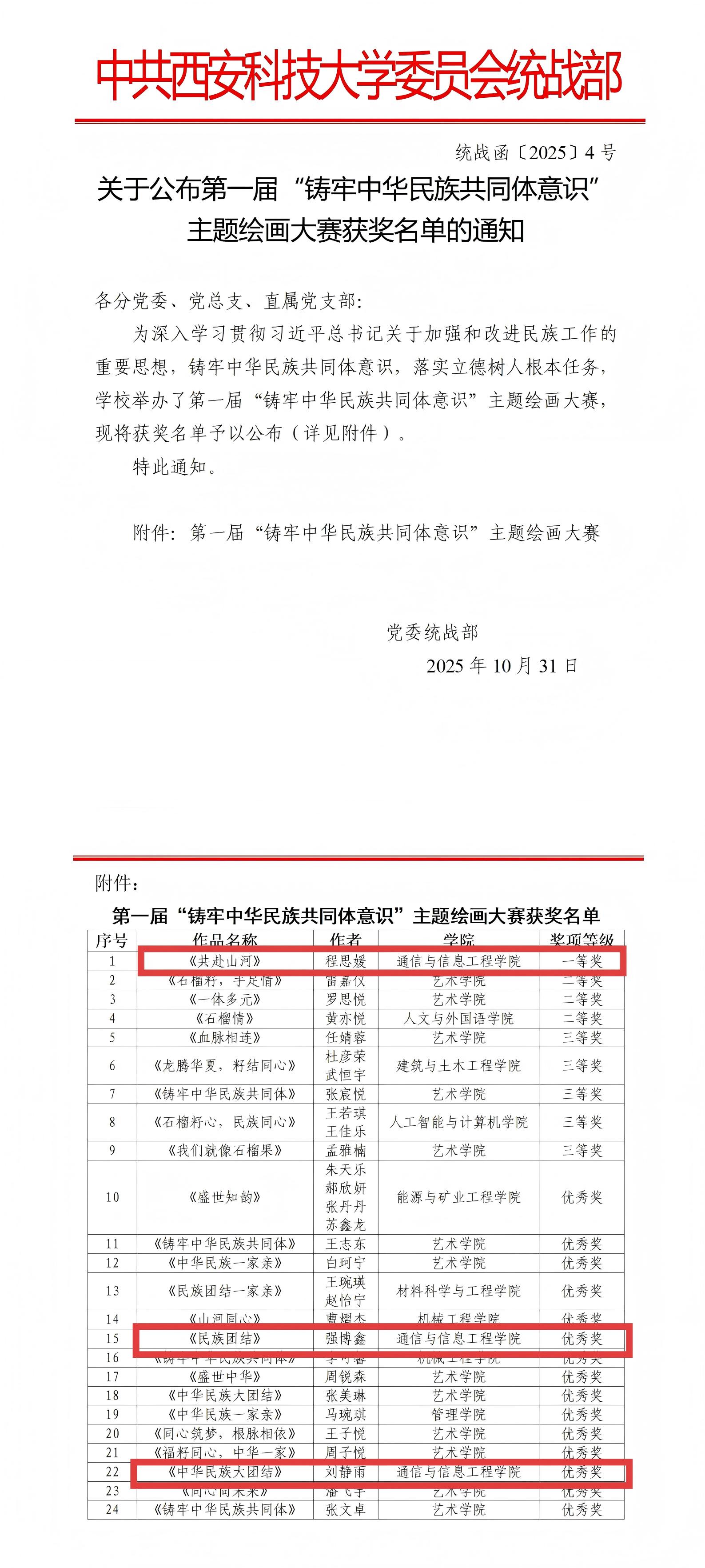 近日,学校公布了第一届“铸牢中华民族共同体意识”主题绘画大赛获奖名单,ok1122诸侯快讯程思媛同学的作品《共赴山河》荣获一等奖、强博鑫同学的作品《民族团结》荣获优秀奖、刘静雨同学的作品《中华民族大团结》荣获优秀奖。