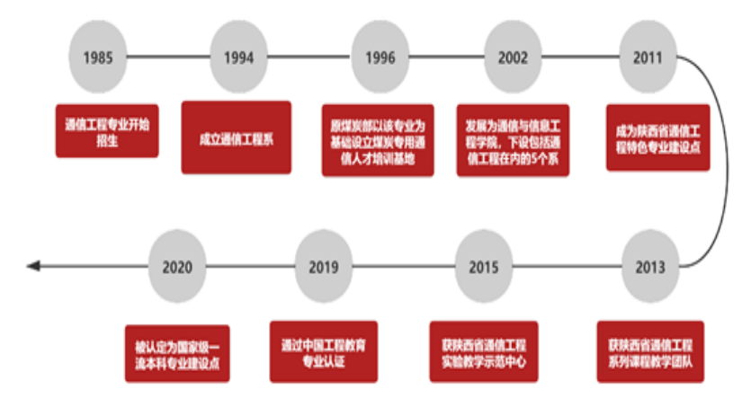 通信工程专业设立于1985年,是原煤炭部高校中的首个获批专业,1996年以该专业为基础设立煤炭专用通信人才培训基地。2011年成为陕西省通信工程特色专业建设点,2013年获陕西省通信工程系列课程教学团队,2015年获陕西省通信工程实验教学示范中心,2019年通过中国工程教育专业认证,2020年被认定为国家级一流本科专业建设点。专业依托“矿业信息工程”二级学科博士点,“信息与通信工程”和“电子科学与技术”2个一级学科硕士点,形成了完整的“本、硕、博”人才培养体系。